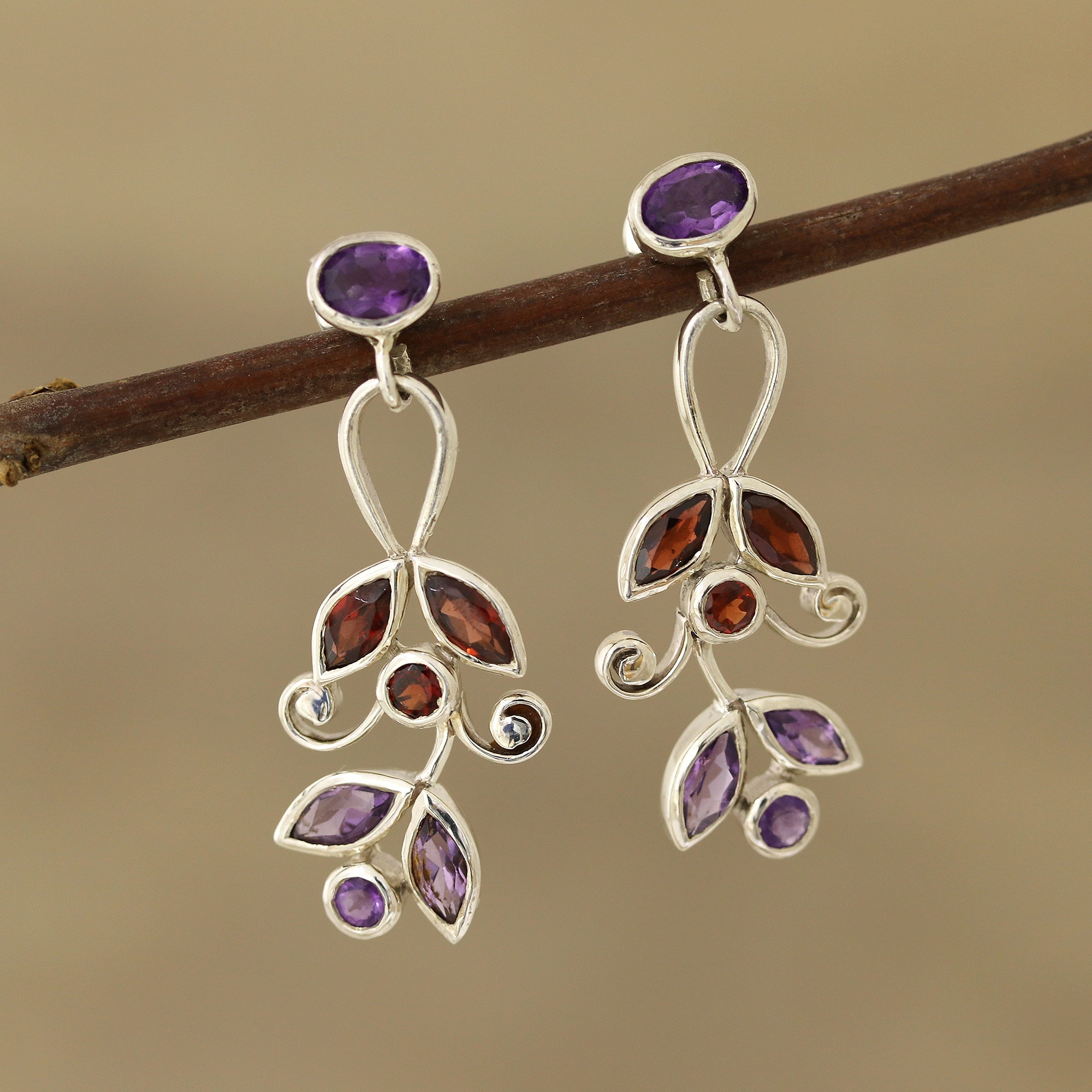 Resembling leaves, dazzling gemstones of faceted amethyst and garnet are cut into marquise, oval, and round shapes. Shubhra Singh designs these nature-inspired Indian dangle earrings, which are handcrafted from sterling silver.
