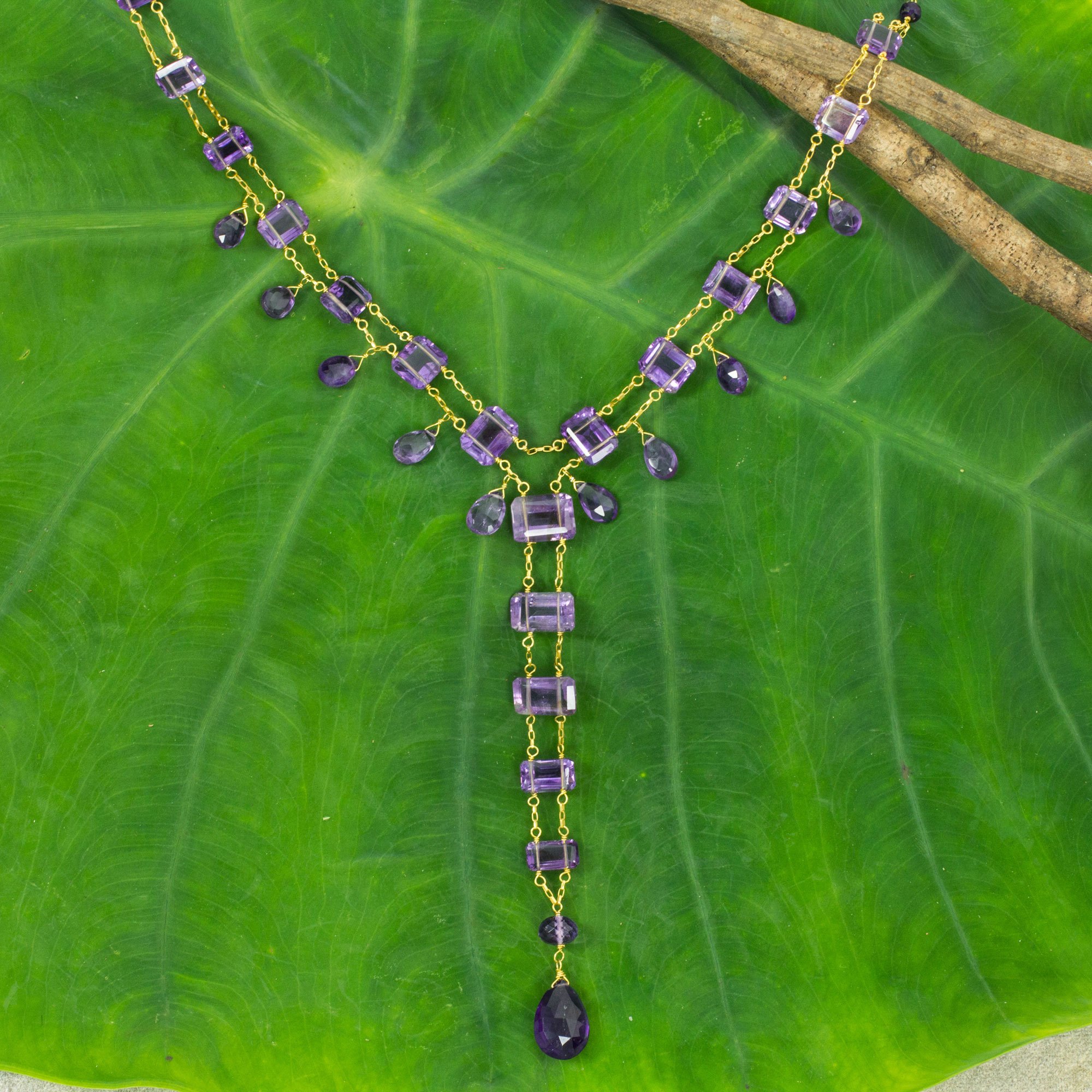 Thai designer Saranarat showcases the mystical beauty of amethyst in a necklace of elegant exuberance. Emerald-cut amethysts unite double chains of 24 gold plated sterling silver in a Y-necklace with amethyst briolletes dangling off the center in the powerful design of this necklace. Totals 96 gemstone carats.