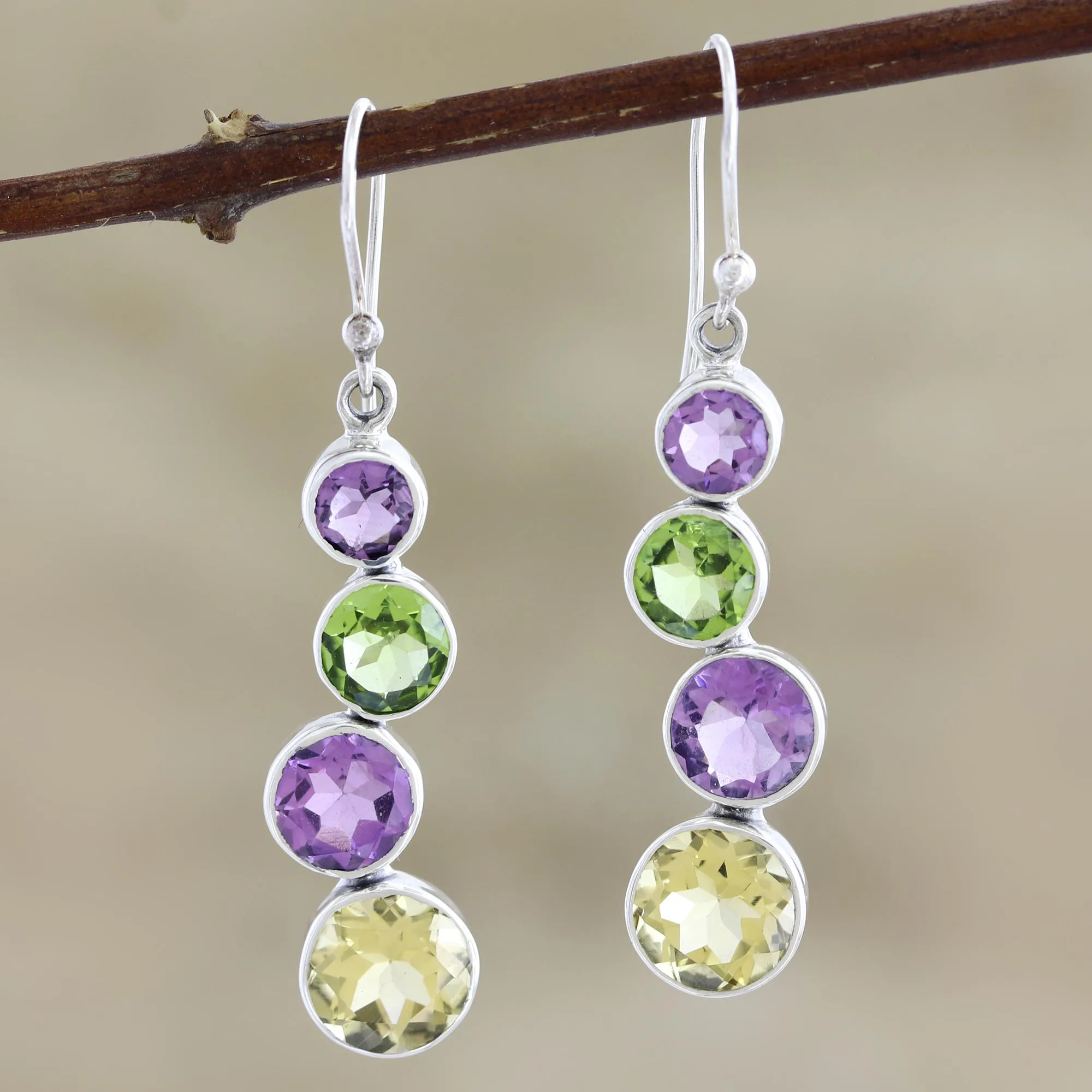 The trio of bright colors in these earrings from Indian artisan Neeru Goel will put some pep in your step. Purple amethyst, yellow citrine, and green peridot gemstones mingle in sterling silver bezel settings, while silver hooks finish the pretty pair.