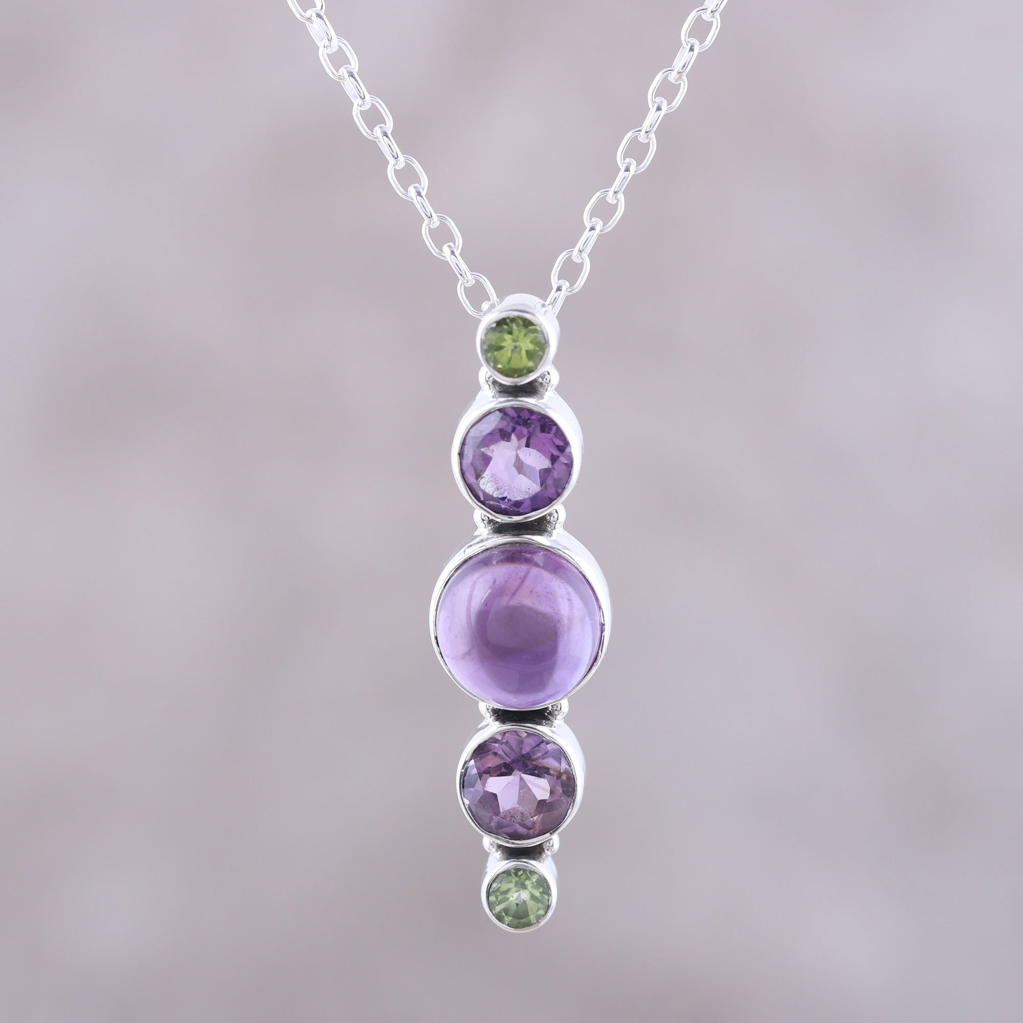 Uniting hues of purple and green, amethyst and peridot gemstones combine in this pendant necklace from India. Presented by Neeru Goel, this accessory is crafted of sterling silver by local artisans.