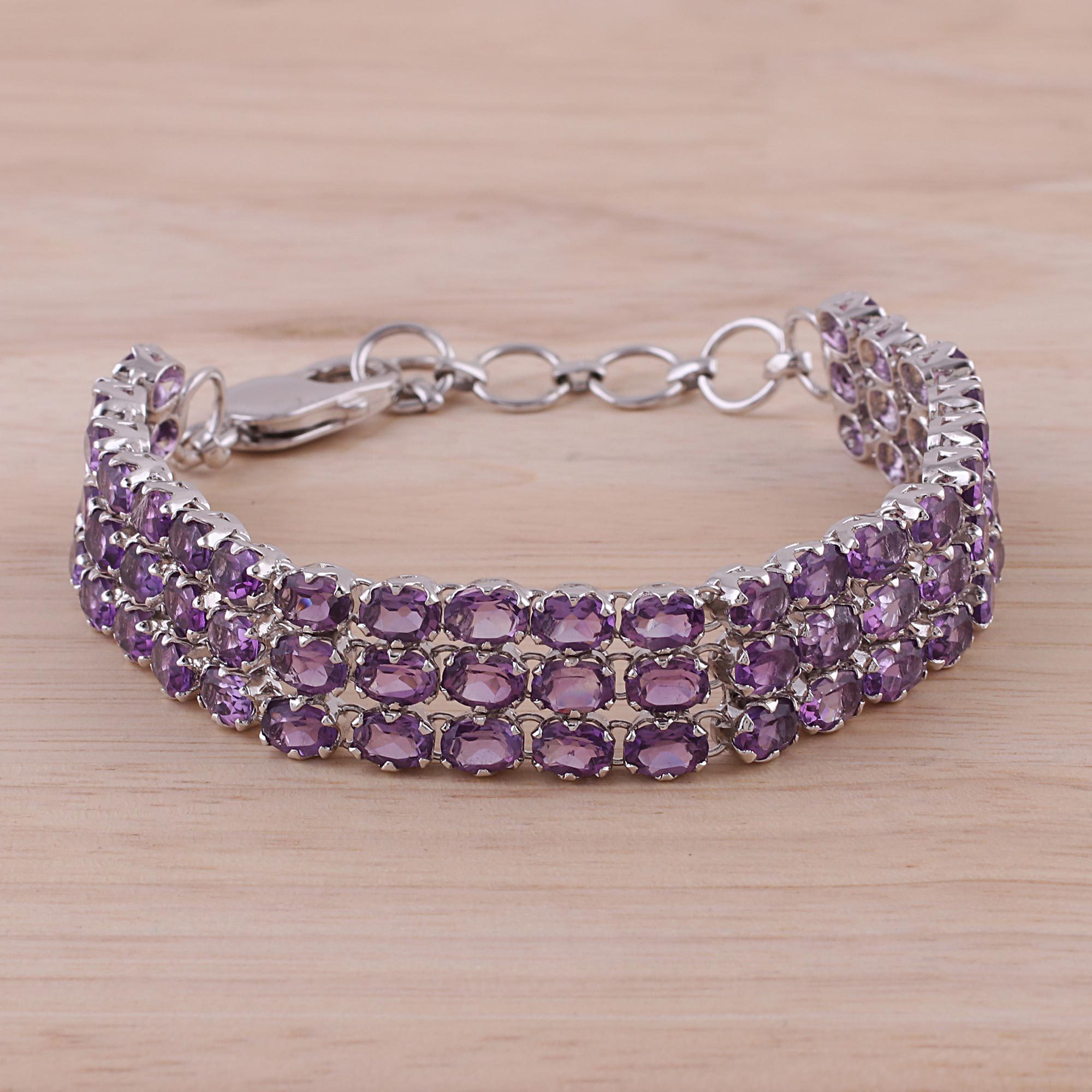 Presented by Alok Jain, this impressive link bracelet features 48 carats of amethyst stones that sparkle with lavender hues. Skilled artisans craft the band, linking the stones together with sterling silver bathed in high-polish rhodium. The length adjusts to fit the wrist.