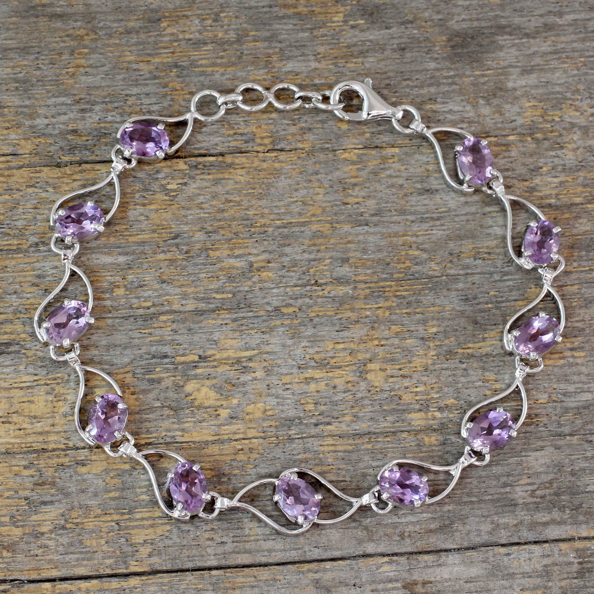 Eleven sparkling carats of lilac amethyst ride the waves in this original link bracelet from Alok Jain. The bracelet is crafted of sterling silver with a gleaming rhodium plated finish. It closes with a lobster claw clasp.
