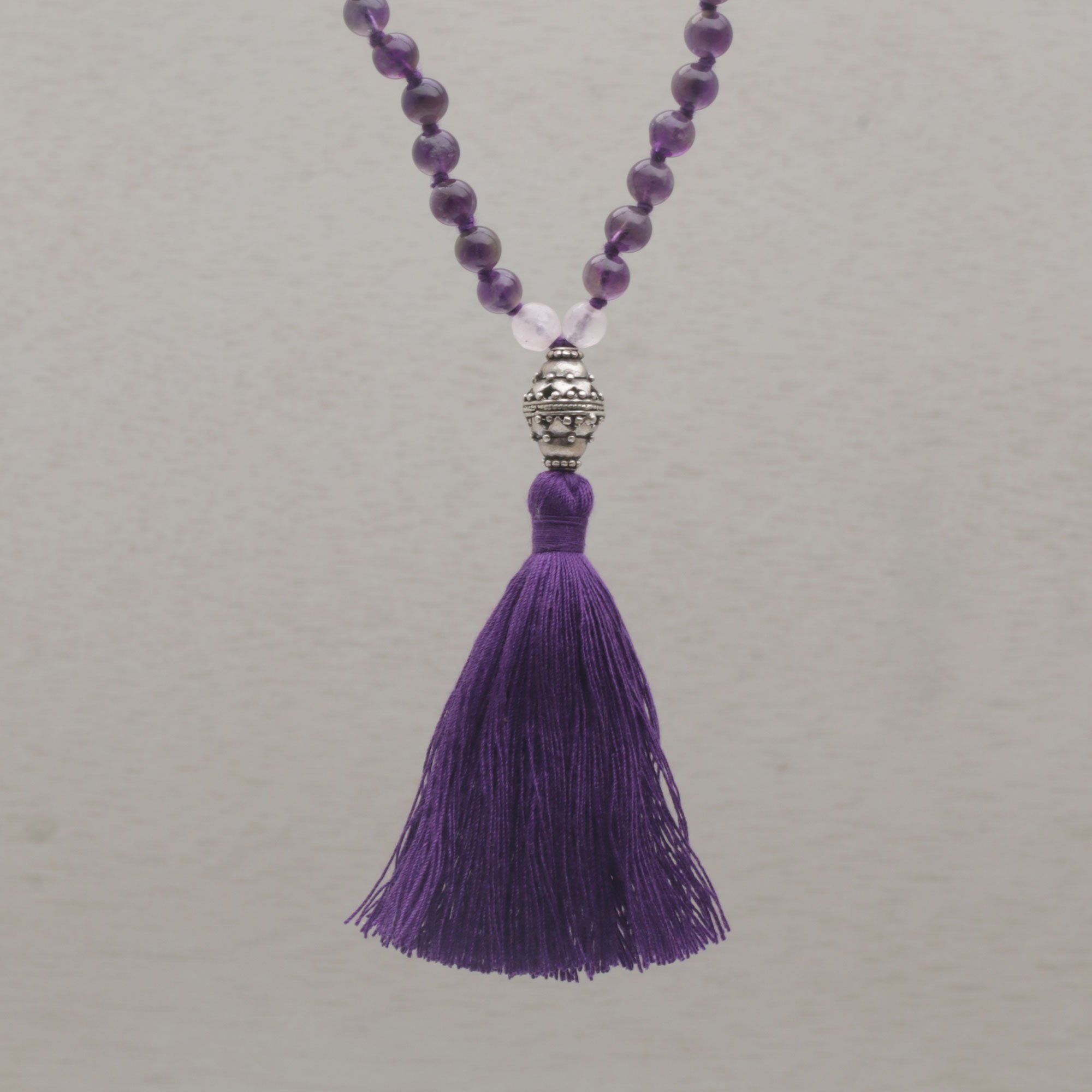 Ketut Sulastri combines the beauty of purple amethyst and pink rose quartz, circling the neck in this beaded pendant necklace from Bali. It is centered by a sterling silver bauble that hosts a tassel pendant of purple thread.