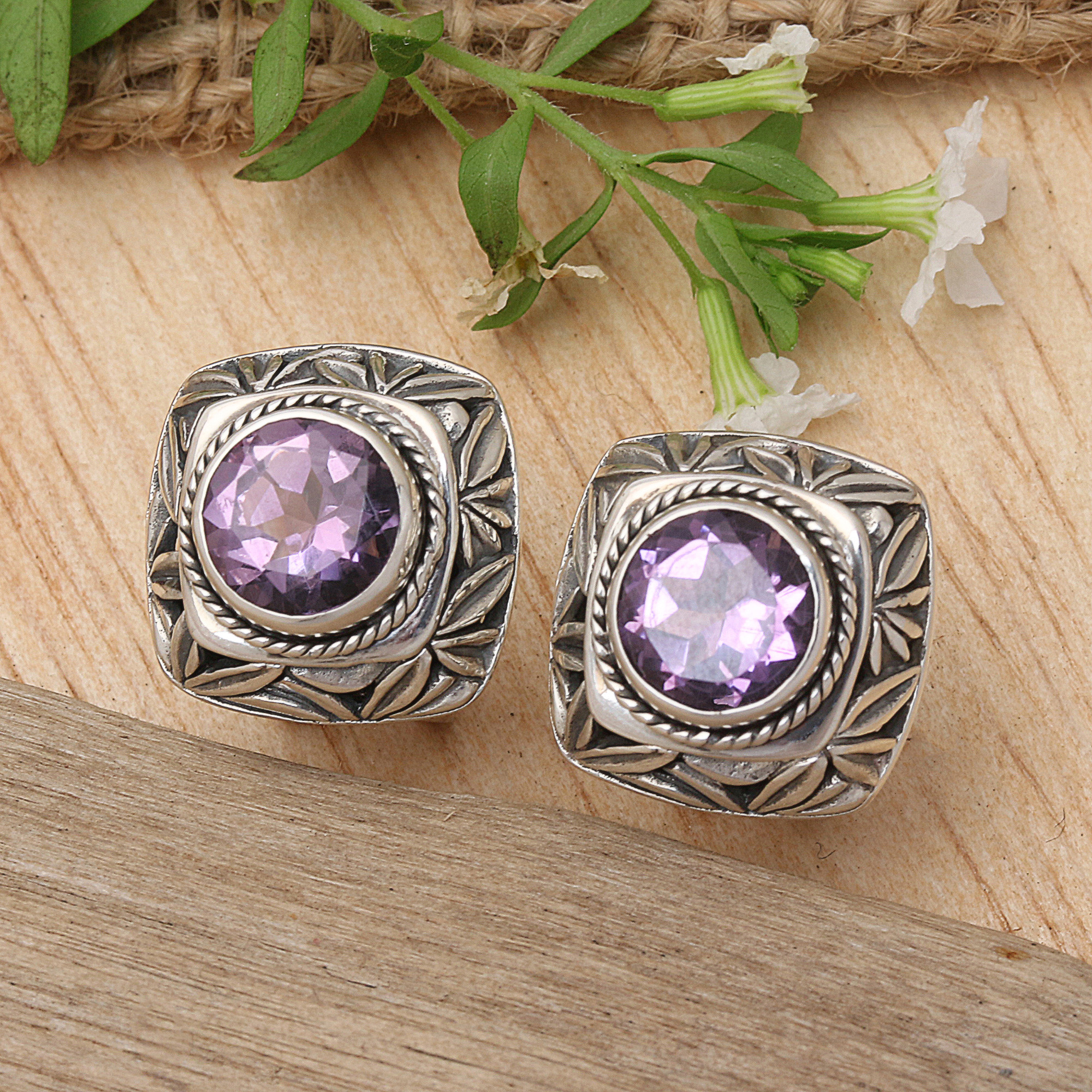 Amethyst and Sterling Silver Button Earrings from Bali, 'Bamboo Shade'
