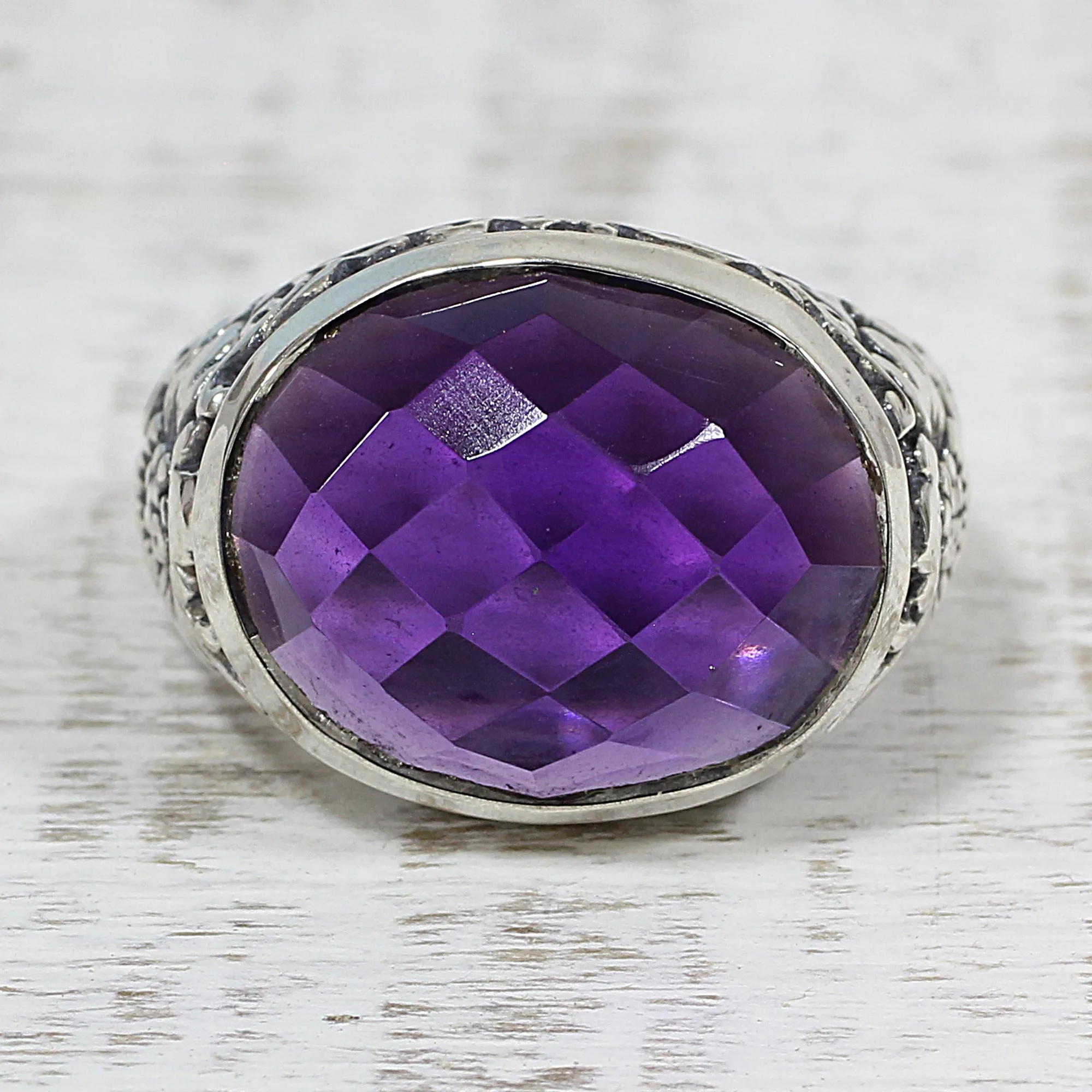 Decorated with elegant floral motifs and a combination of finishes, this Indian cocktail ring is handcrafted of sterling silver, presented by Chintan. Local artisans create the ring, adding a checkerboard-faceted stone of amethyst to the crown that weighs over ten carats.