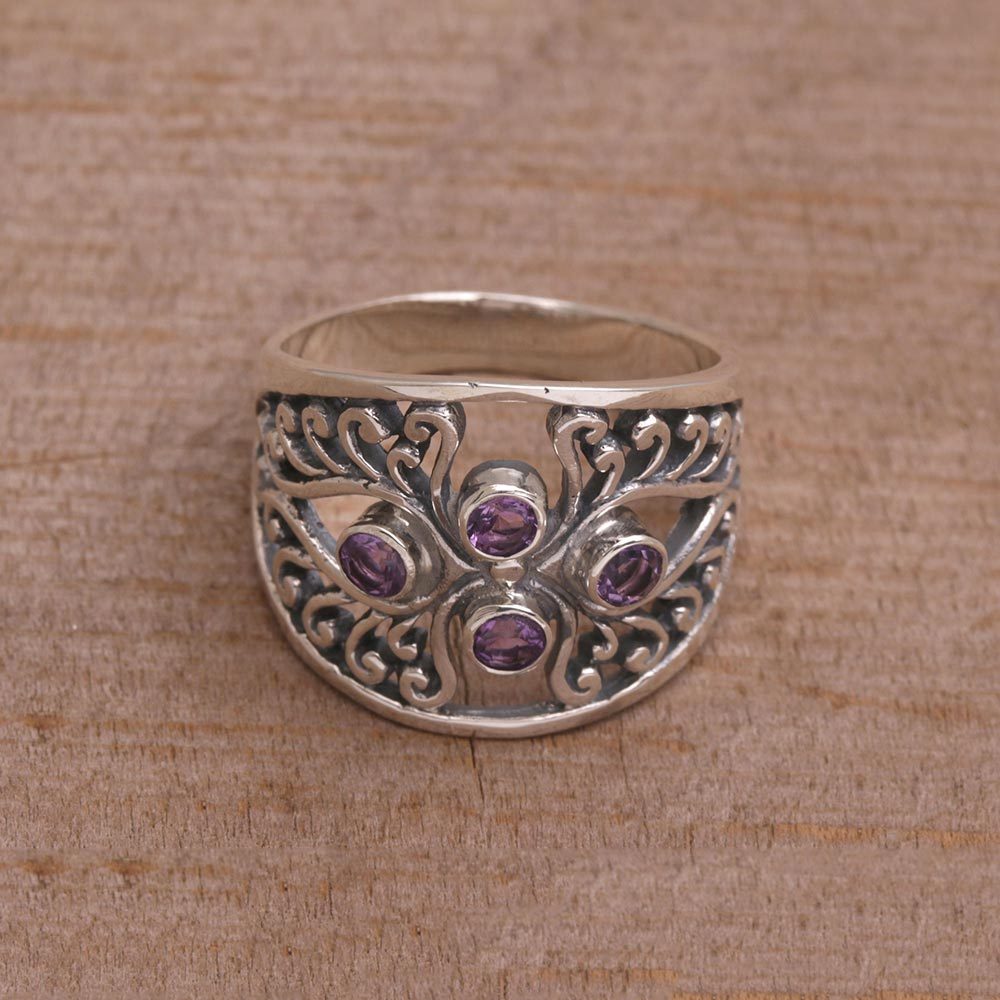 Evoking the lovely beauty of a vine, this cocktail ring from Bali is crafted of sterling silver by local artisans, who elaborate it with openwork spiral motifs. Four petite purple amethyst gemstones decorate the ring at the center. Made Sudiari designs this queenly accessory.