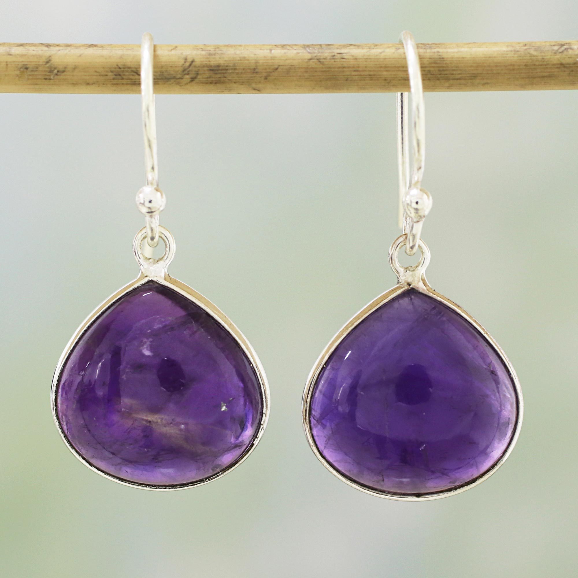Two elegant teardrops of amethyst dance below the ears in this pair of dangle earrings from India. Neetu Barathi chooses amethyst as a stone that alleviates stress, framing each with high-polish sterling silver that hangs on hooks.