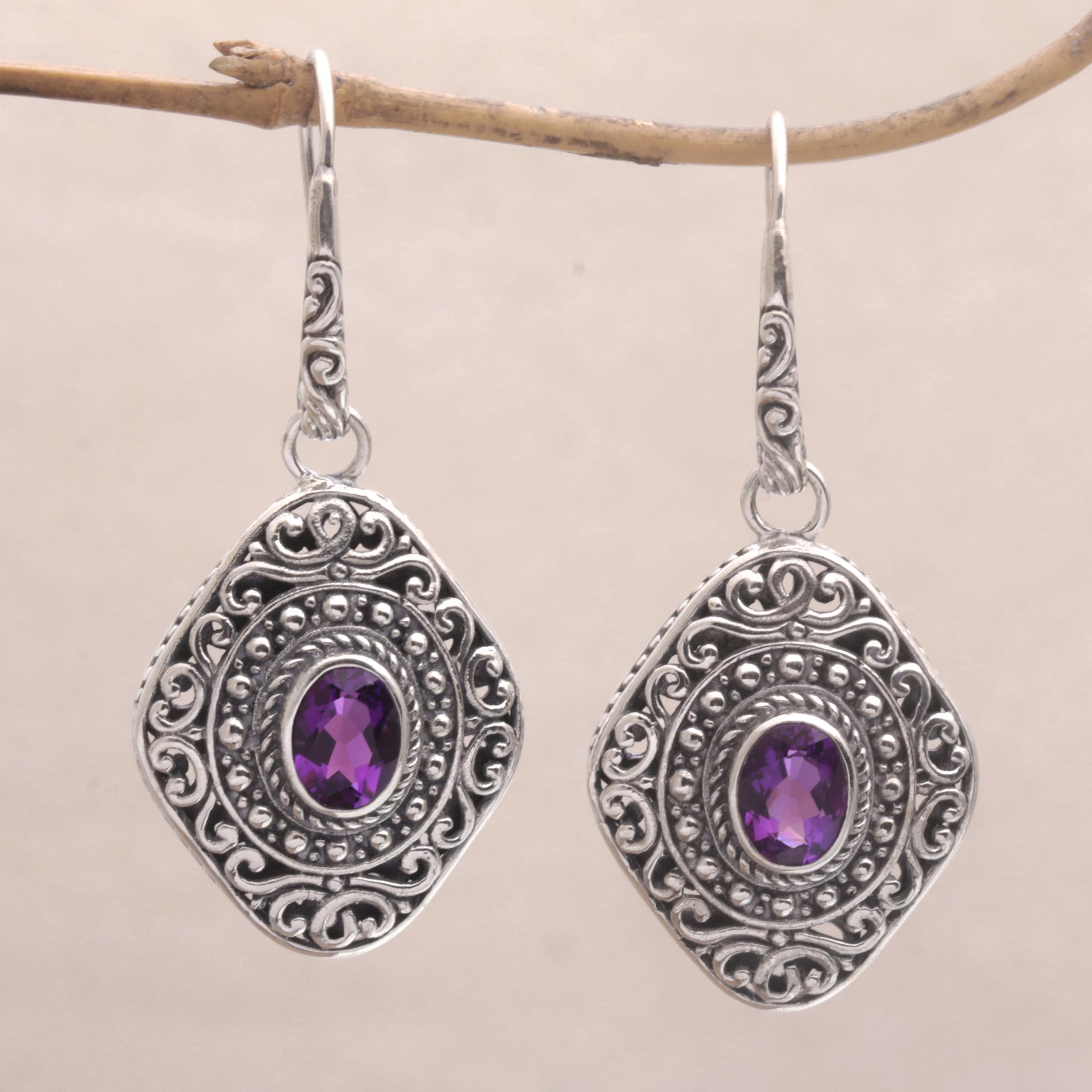 Add Balinese flair to your look with this gorgeous pair of dangle earrings from Made Sugi. Over two total carats of faceted amethyst dazzle from the center of the sterling silver earrings, bordered by intricate traditional bun and jawan silverwork. The crest-shaped earrings are enhanced with oxidization which creates a stunning contrast between the elegant gemstones and silver details.