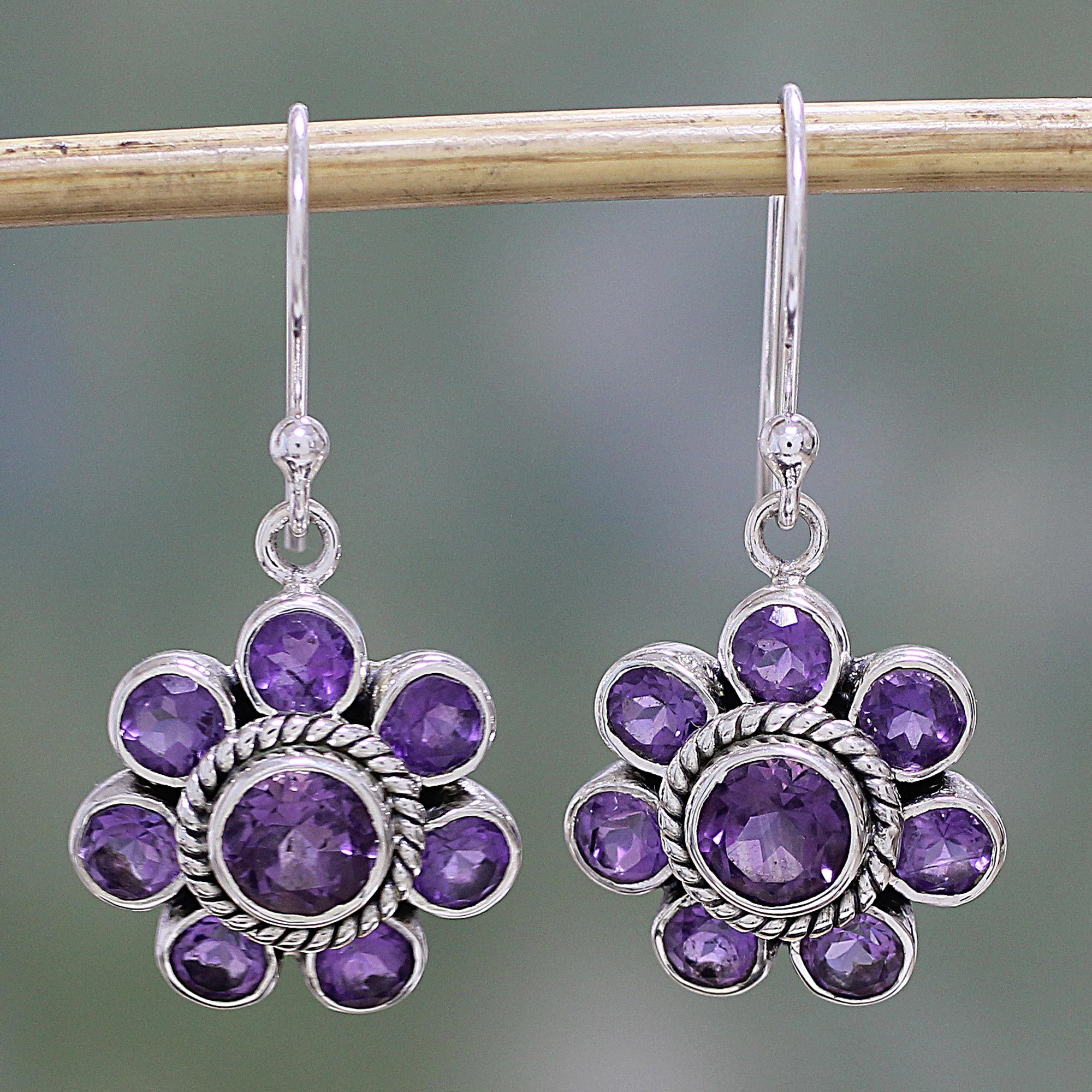 Amethyst and Sterling Silver Dangle Earrings from India, 'Morning Glitter in Purple'