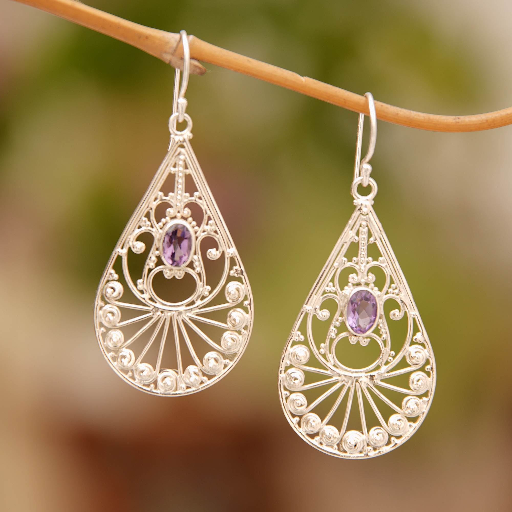 Housing over one carat of oval amethyst stones, these Balinese dangle earrings are designed by Wayan Neri. She crafts each one in a teardrop shape, featuring elaborate sterling silver spiral motifs for a divine accessory.