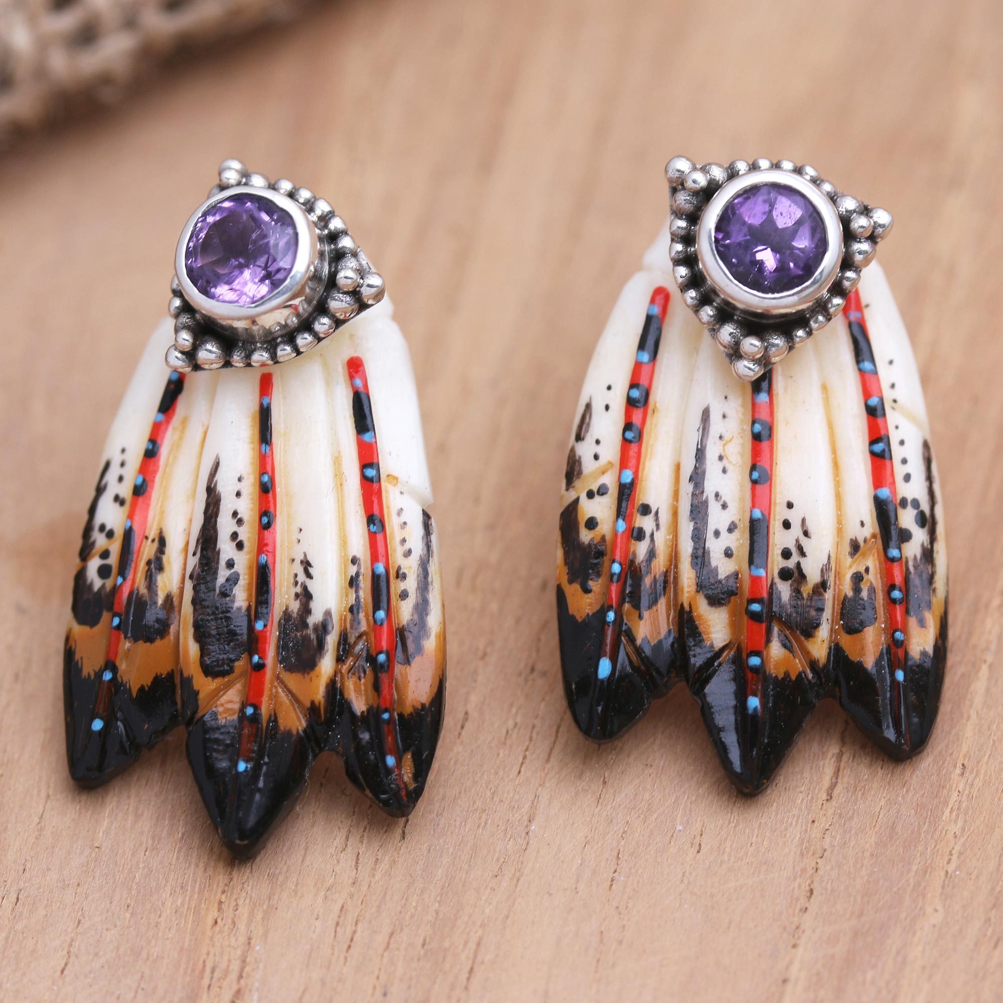 Designed to resemble feathers, Ayu Ary's beautiful earrings are sure to attract admirers. The Balinese artisan hand carves the earrings from pale bone before painting the surface black and brown in a convincing feather motif. A faceted amethyst gemstone in a bezel setting shines at the top of the pretty pair.