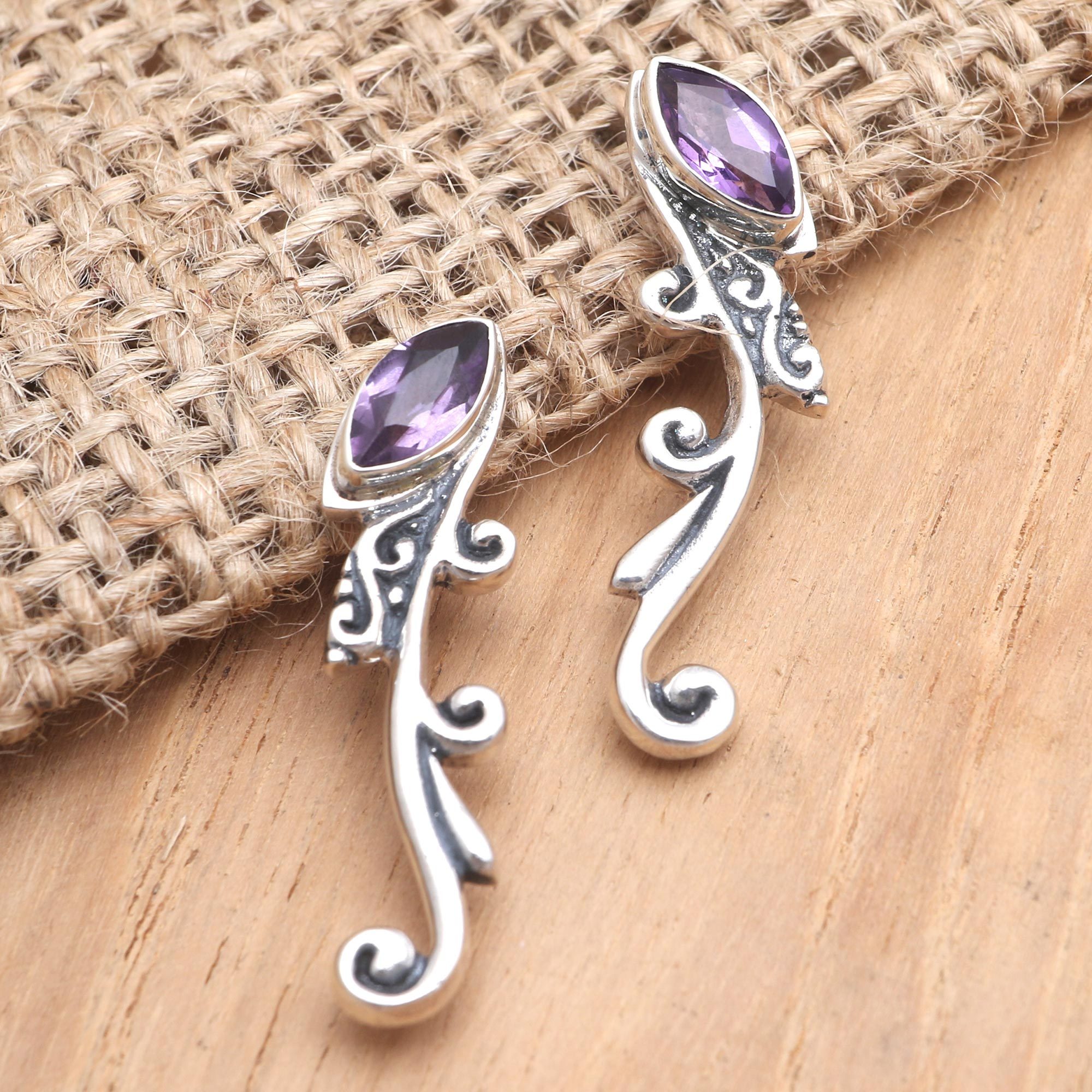 Inspired by nature, Suar Dwipayana in Bali designs a beautiful pair of earrings from cool silver and purple gems. The artisan starts by placing a faceted amethyst gem in a bezel setting, letting tendrils of sterling silver curl downward and away from your ear.