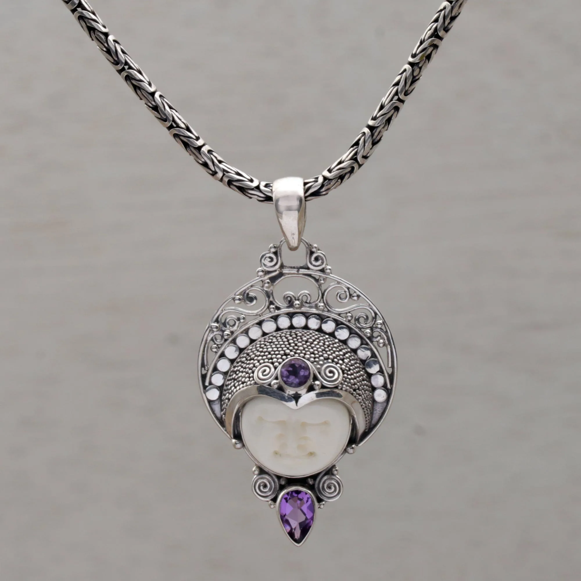 Inspired by ancient Balinese royalty, Komang Suastra designs this regal pendant necklace to feature the face of a queen, hand-carved from bone. Wearing an elaborate, moon-shaped crown of sterling silver, the queen is accented with purple amethyst gemstones that sparkle in the light. The pendant centers a length of Borobudur chain.