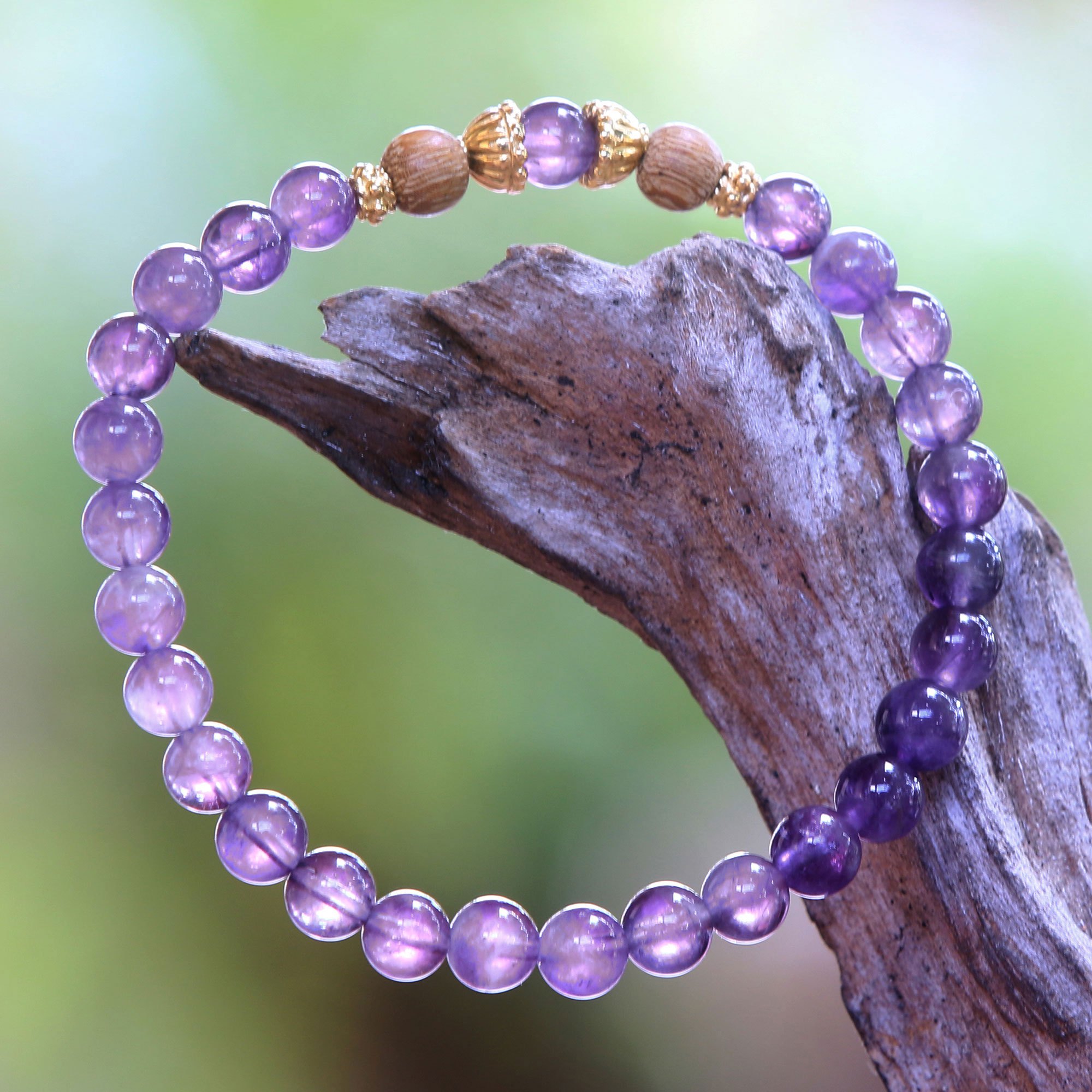 Choosing gems of cool amethyst, Balinese artisan Ketut Sulastri strings this beaded stretch bracelet with a musical harmony. The bracelet is accentuated with petite beads of 22k gold plated sterling silver and coconut wood. Sulastri names the bracelet after Batuan, a Balinese village noted for its handicrafts.