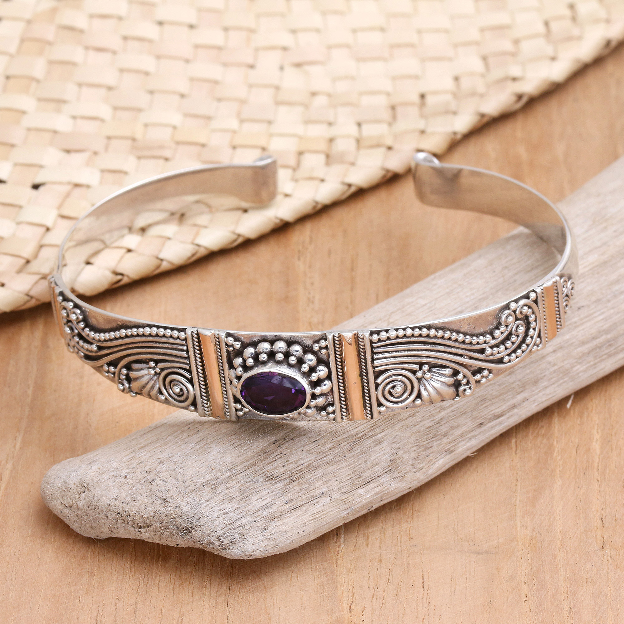 Sterling leaves and vines conjure the Garden of Eden. Adorning a slender silver cuff, they distinguish this bracelet by Kenari. In the center, a sparkling 1 carat amethyst is flanked by bands of 18k gold plate.