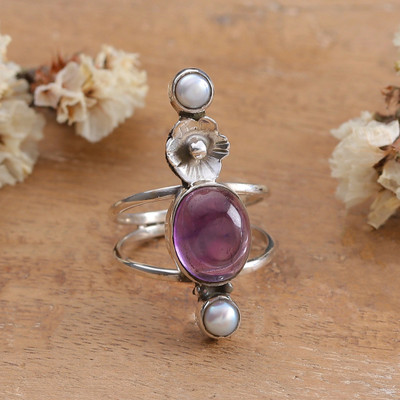 The spirit of the ocean comes from the depths to greet you with an exquisite creation of precious jewels. Designer Arpita Sharma of India captures the sea's soul in this sterling silver cocktail ring, crowned with an amethyst stone as a symbol of wisdom. Cultured pearls in a natural grey hue accompany the main jewel, adding the essence of the ocean to this fantasy-themed piece.