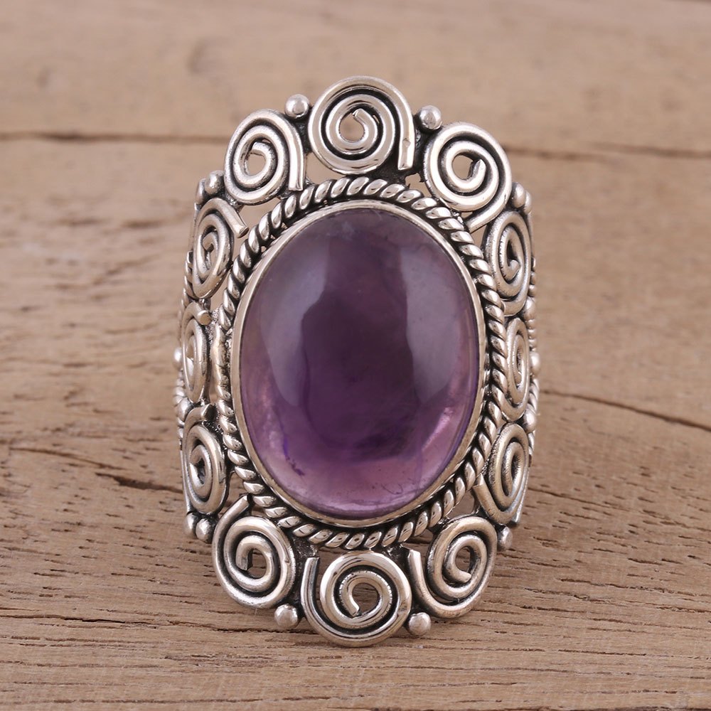 The twilight-hued glow of amethyst is mesmerizing in this cocktail ring from Alok Jain of India. Artisans set the cabochon gemstone in sterling silver, surrounded by a rope-motif bezel and wirework spirals. Amethyst is the birthstone of the February-born, as well as a popular gem for daily wear.