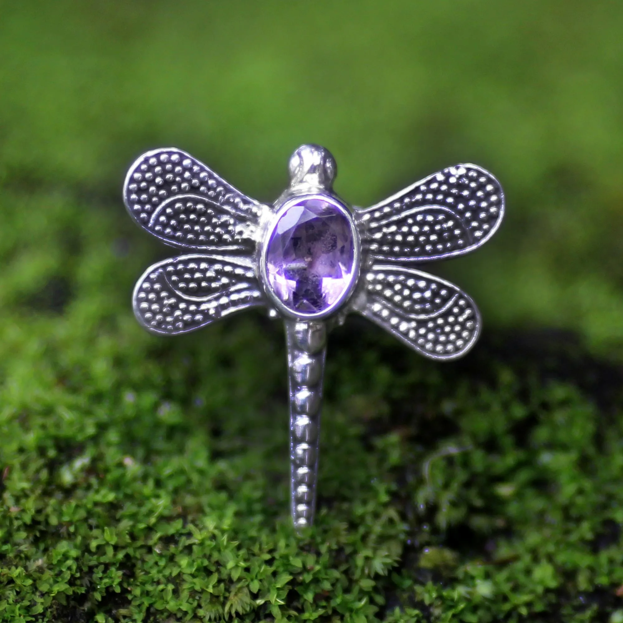 Alighting on a sterling ribbon, a dragonfly poses on this handcrafted design. Faceted amethyst totaling 1 carat sparkles in the center of this ring, presented by Sukartini in Bali.