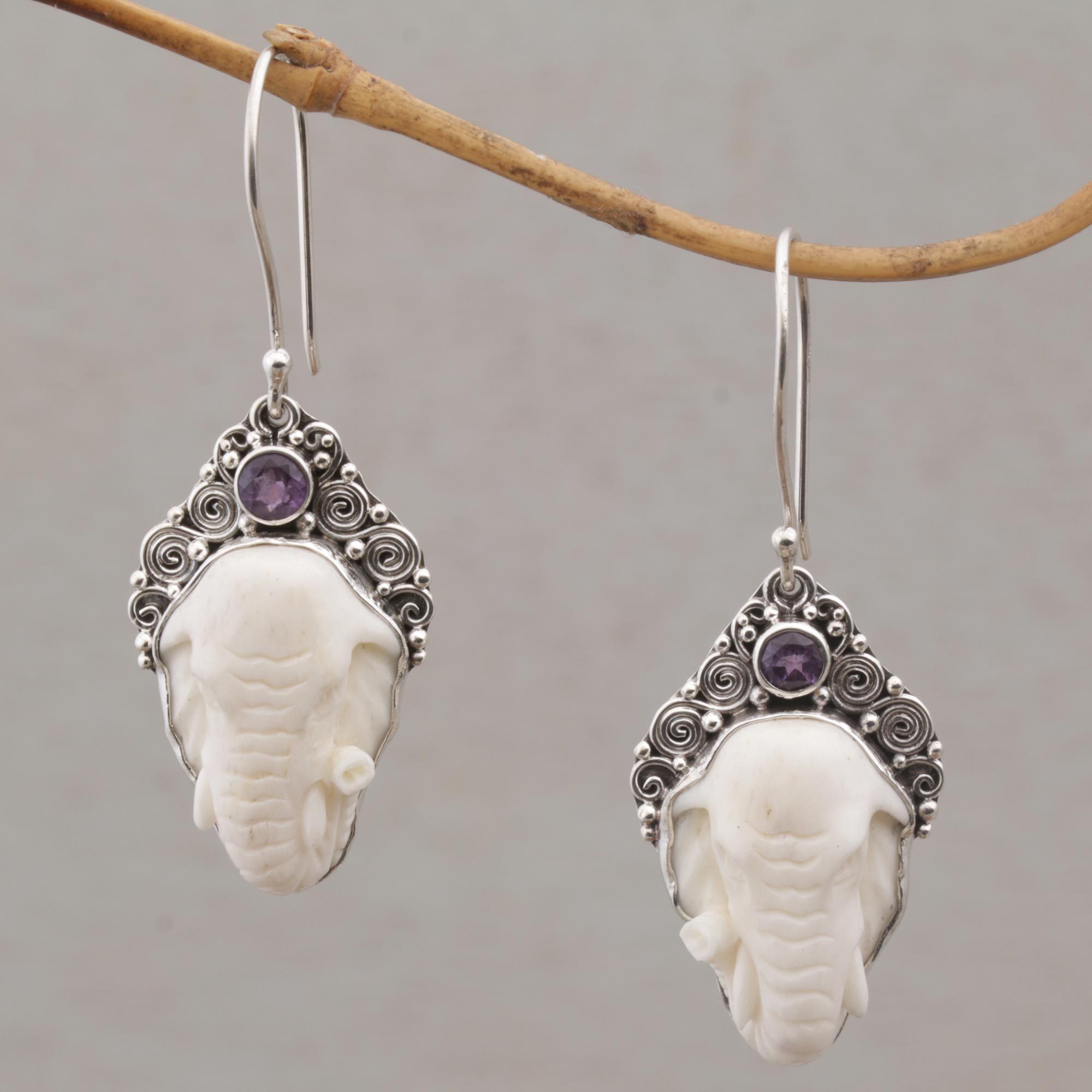 Regal elephants, carved by hand of smooth white cow bone, grace these earrings from Bali's Made Wardika. The artisan crowns the pachyderms with traditional Balinese bun (wire) and jawan (granule or dot) sterling silver motifs, as well as faceted lilac amethyst stones. The earrings sway on sterling silver hooks.