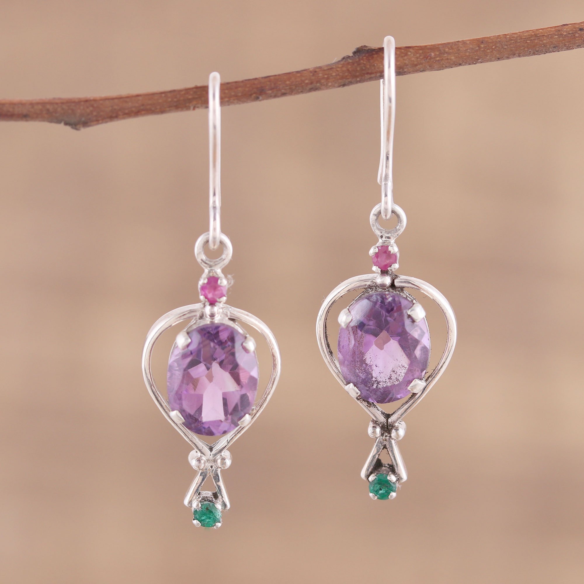 Amethyst Emerald and Ruby Dangle Earrings from India, 'Sparkling Allure'