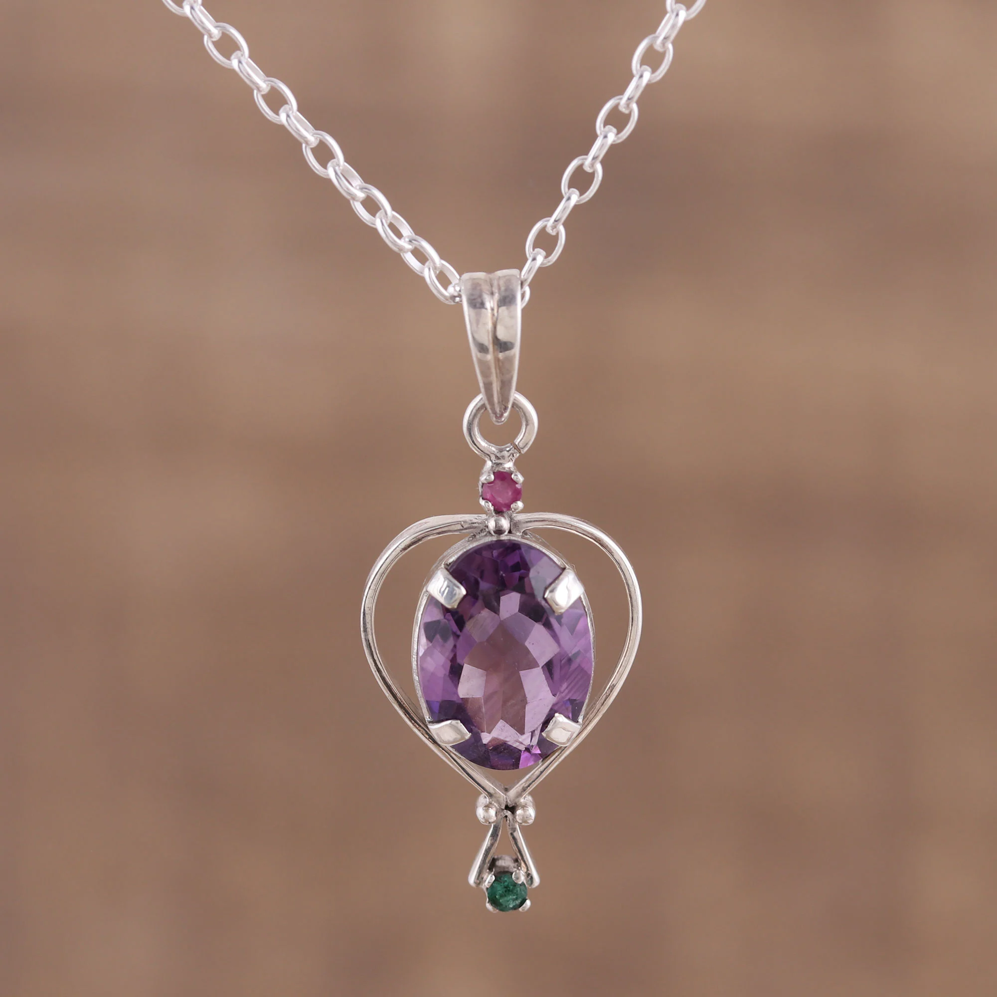 Amethyst Emerald and Ruby Pendant Necklace from India, 'Sparkling Allure'