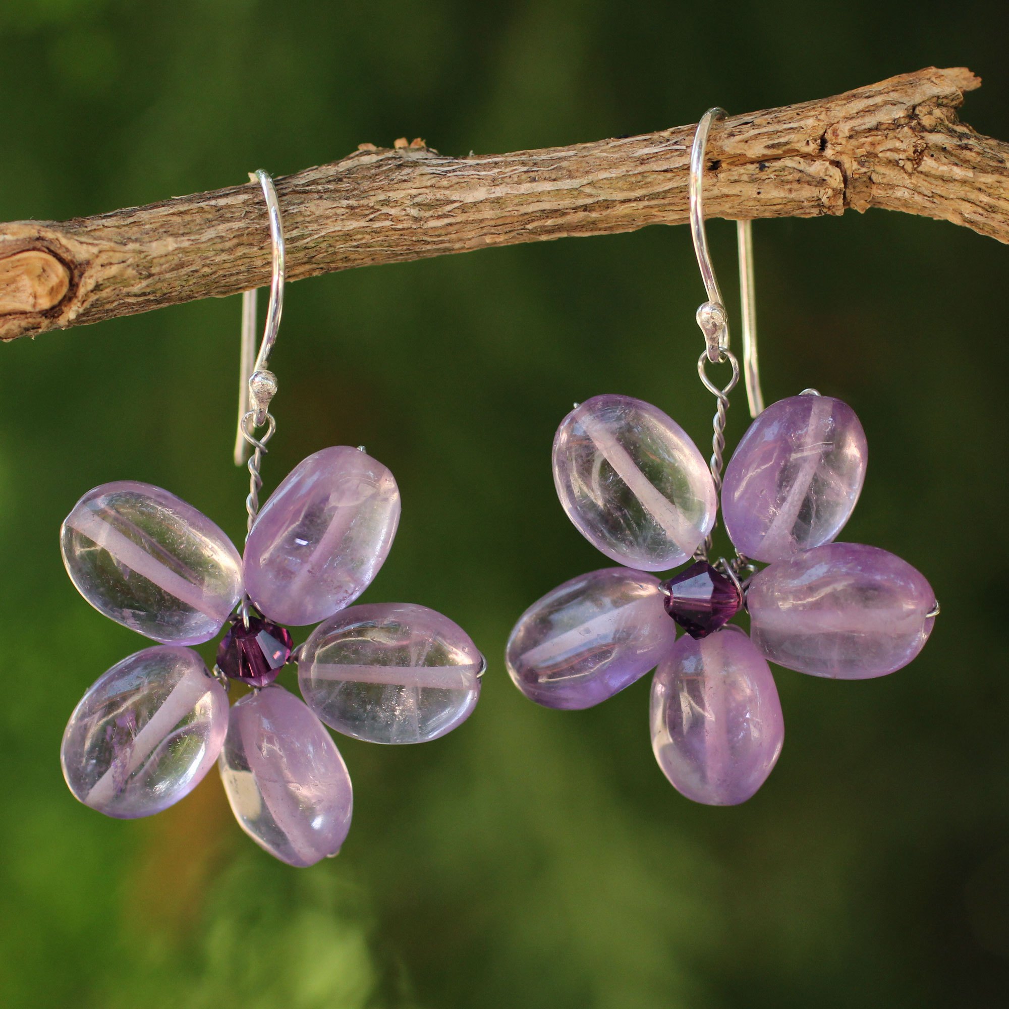 A mystical daisy opens its translucent petals to the morning sun in the captivating design of these earrings. Nareerat crafts the earrings by hand with amethyst, gem of sincerity and spiritual wisdom.