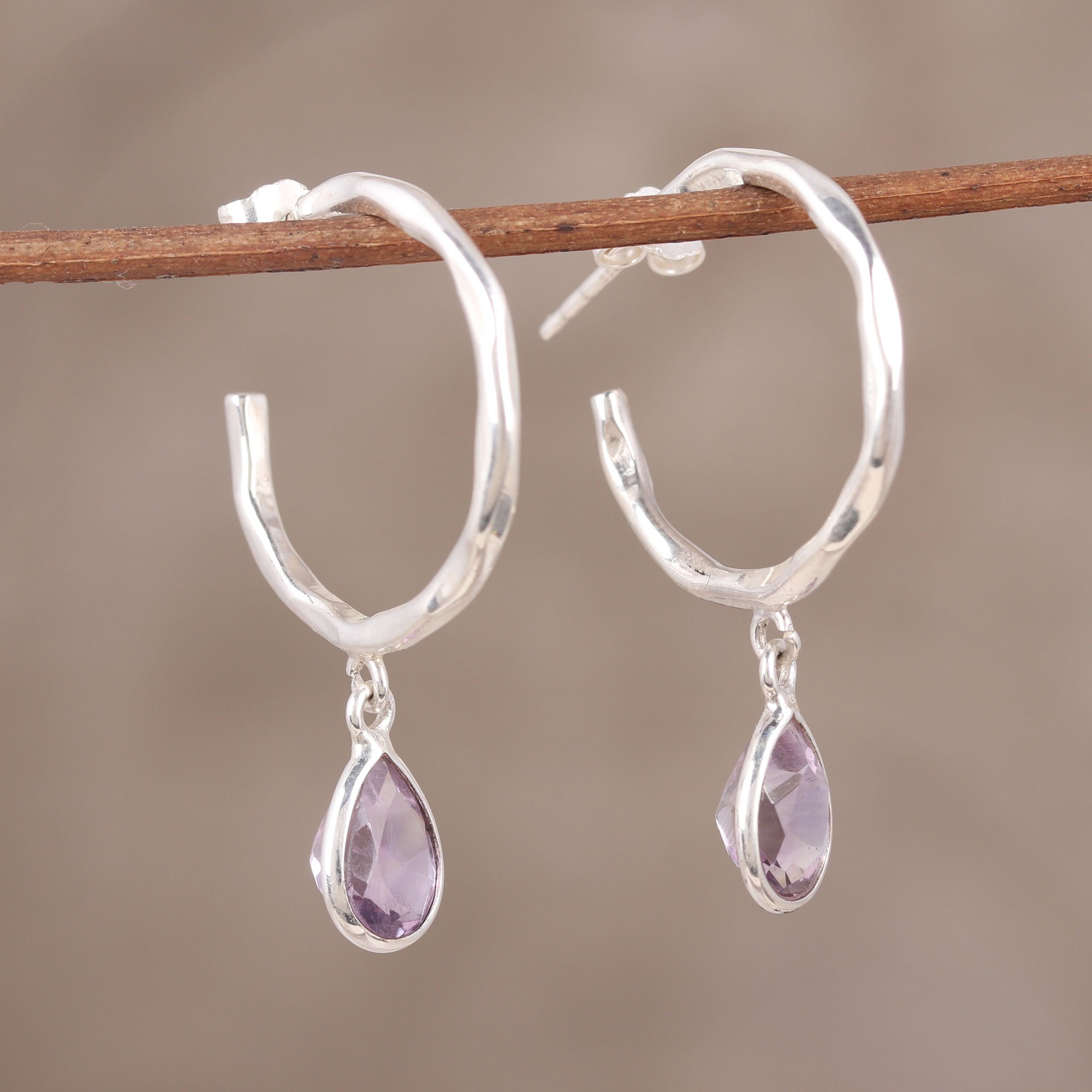 Amethyst Half-Hoop Dangle Earrings from India, 'Crescent Drops'