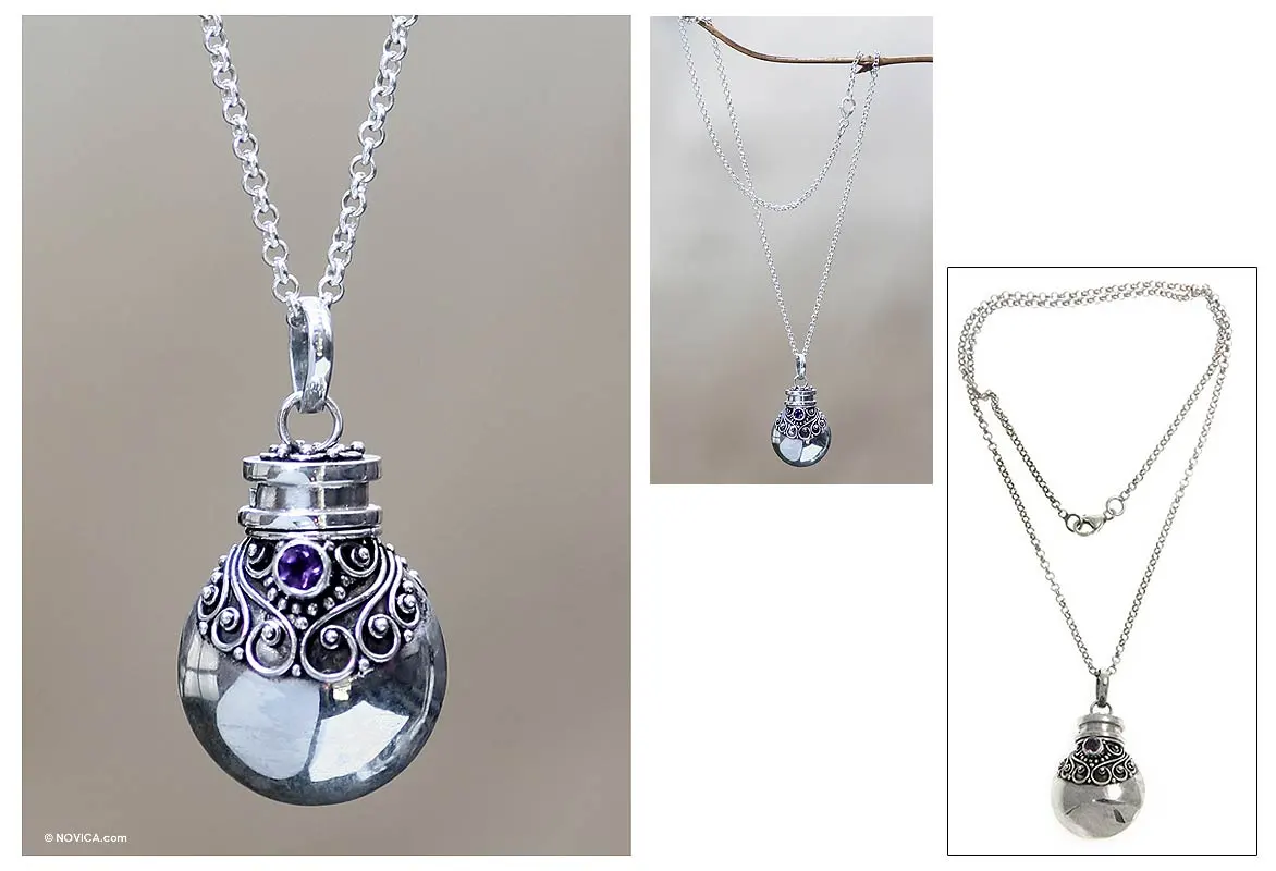An amethyst sparkles on a pendant of ancient splendor. Crafted of sterling silver, the pendant is crafted in the shape of the classic arak bottle, designed for a liqueur fermented either from coconut palm flower, or from black glutinous rice and coconut milk. Sukartini presents the ornate bottle pendant, which opens, on a rollo chain.