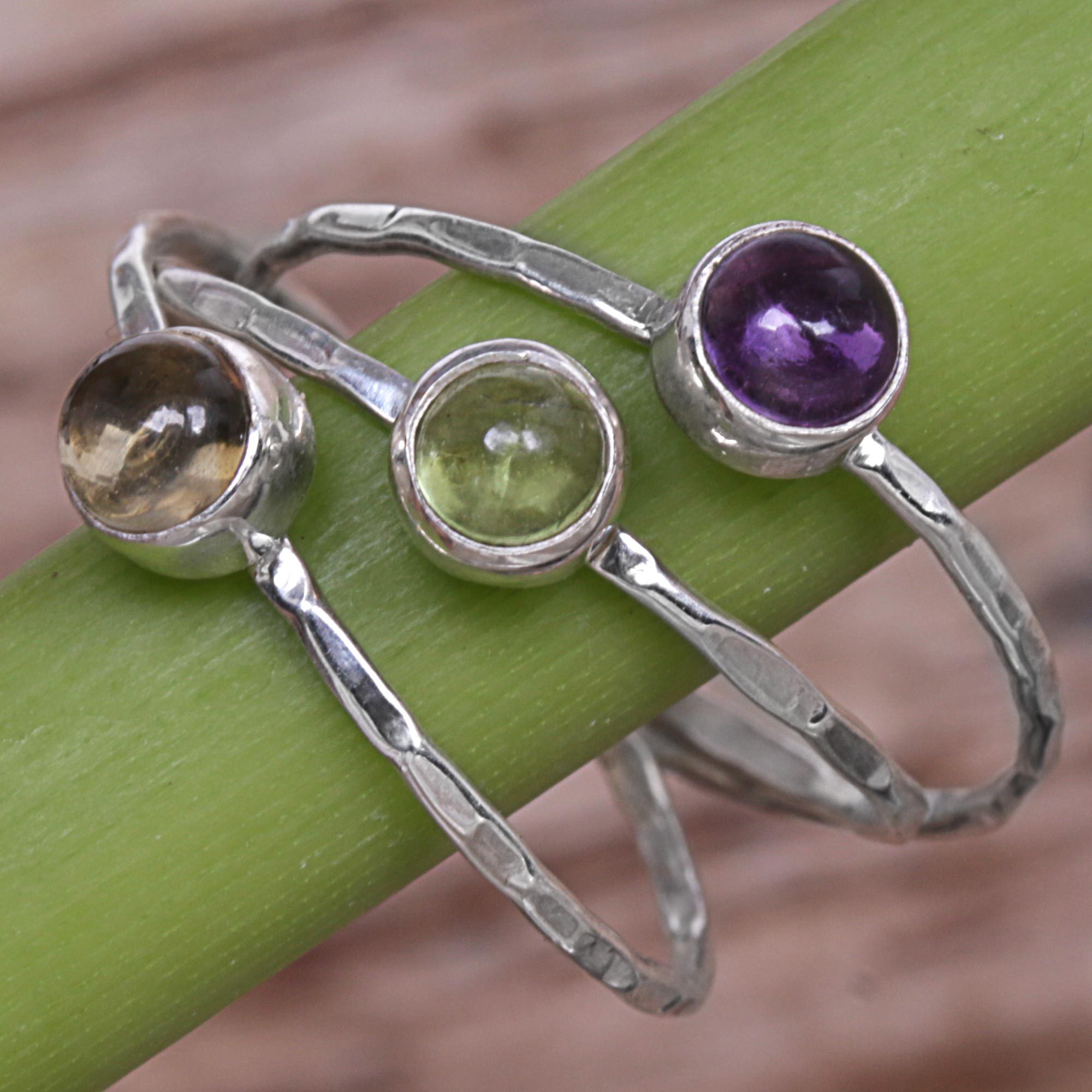 Stones of amethyst, peridot, and citrine achieve a sleek, yet complex look atop this multi-stone ring. Indonesia's Ketut Sulastri designs it with three interlocking bands that are handcrafted from hammered sterling silver.