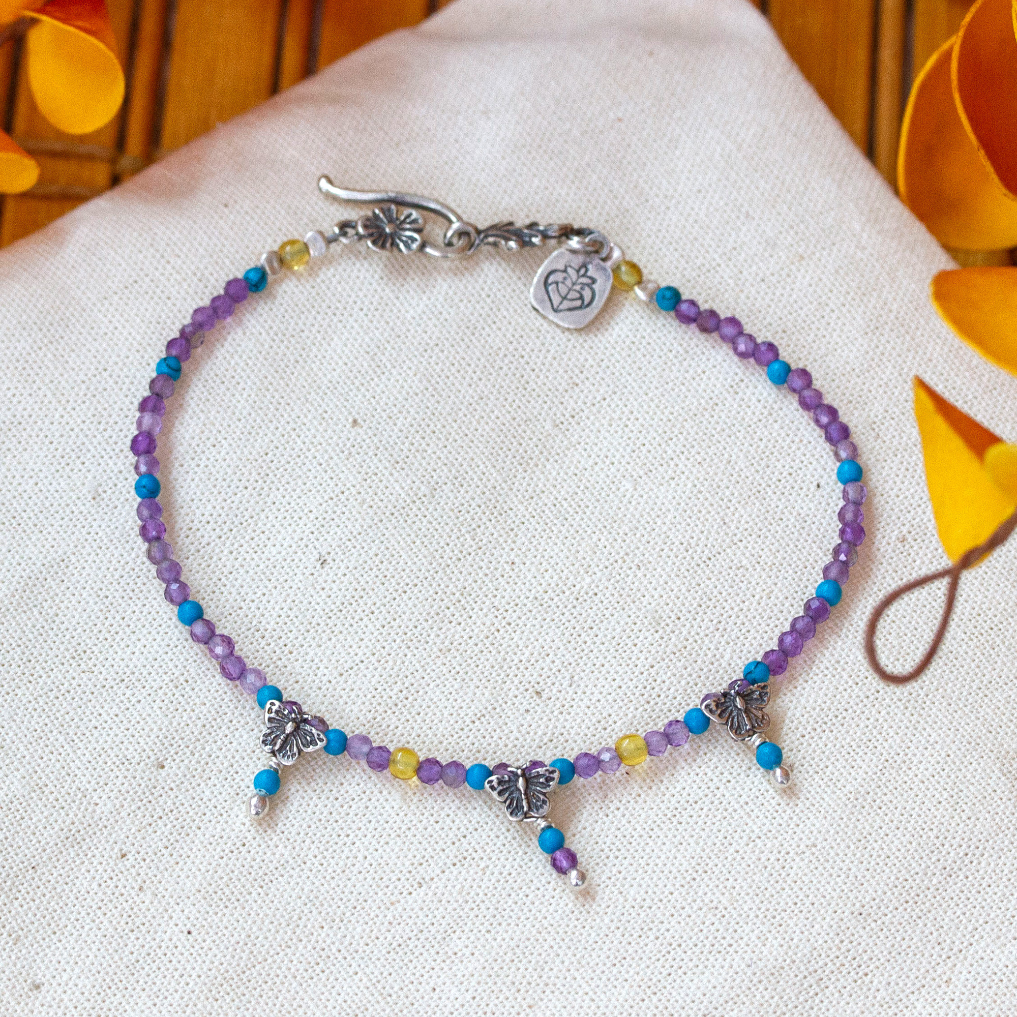 Adorn your wrist with a fluttering of vibrant hues! This lovely bracelet from Mexican artisan Flora Maria captivates with three butterfly-inspired sterling silver charms, each one flanked by the rich purples of amethyst, the serene blues of reconstituted turquoise and the warm glow of amber. This colorful design brings unparalleled vibrancy and natural allure to your look.