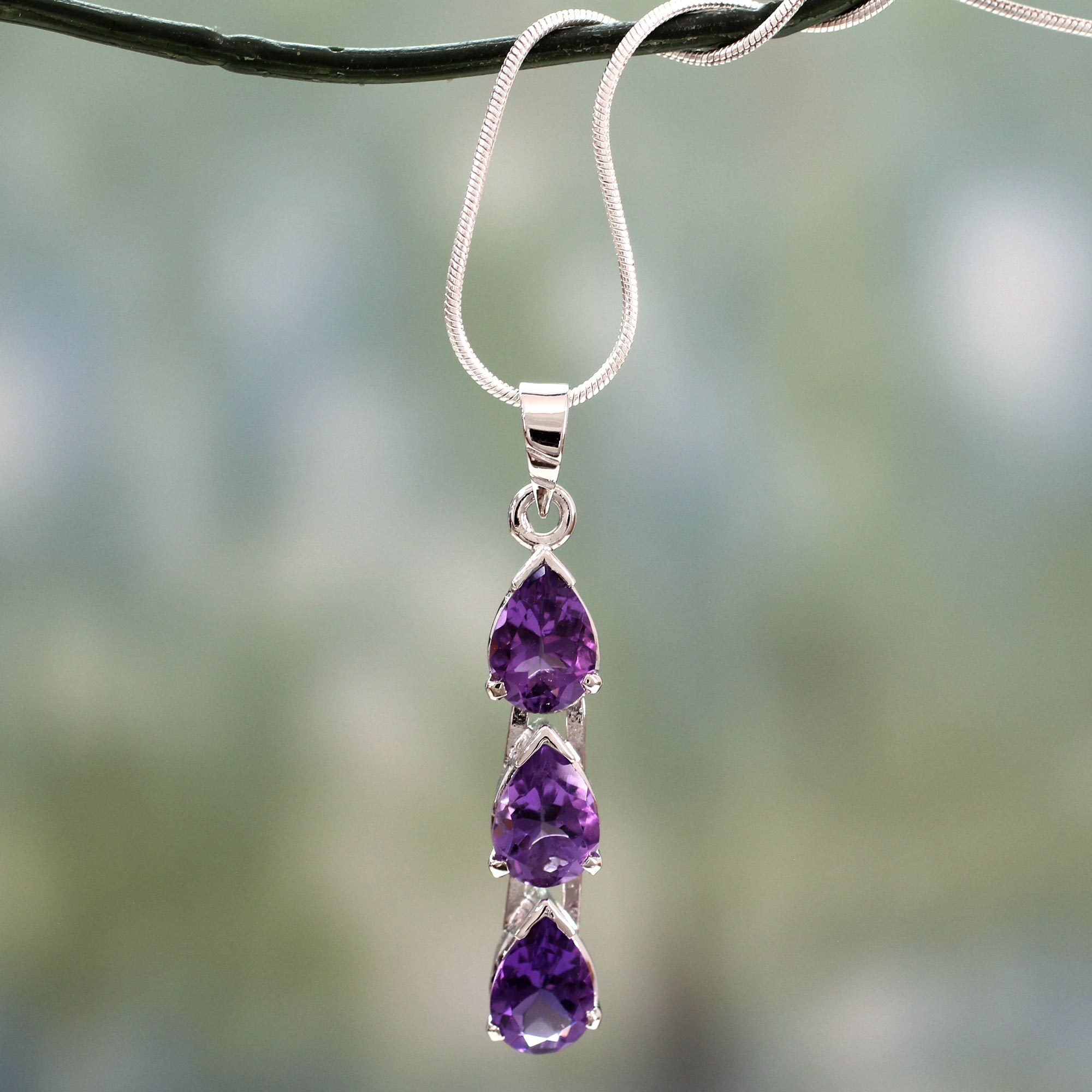 Sparkling amethyst forms a cascade of violets set in sterling silver. Associated with spiritual awareness, the lilac gem is thought to cleanse, purify, restructure and renew. This exquisite necklace comes from India's Alok Jain.