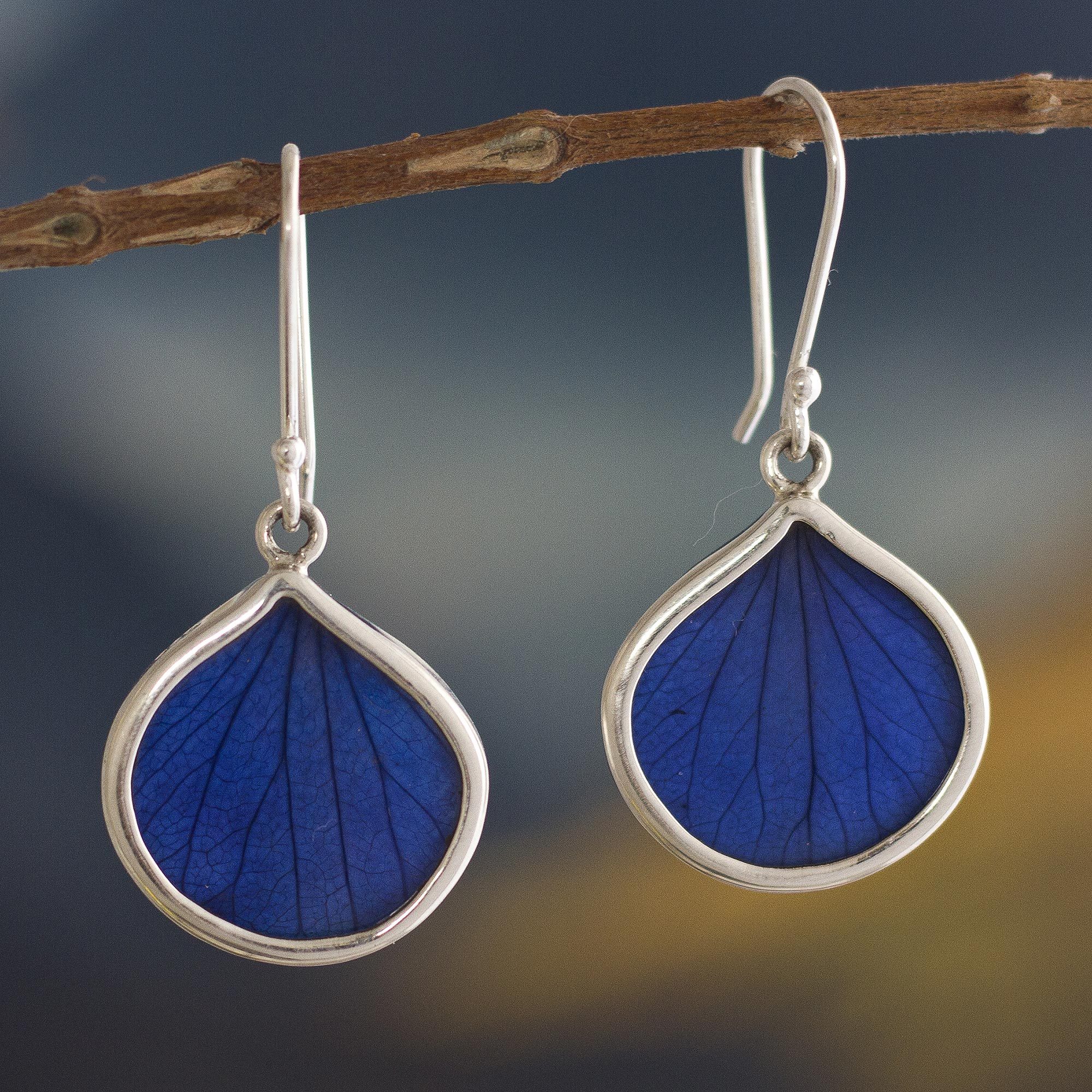 Andean Handmade Sterling Silver Blue Leaf Earrings, 'Blue Leaf Drops'
