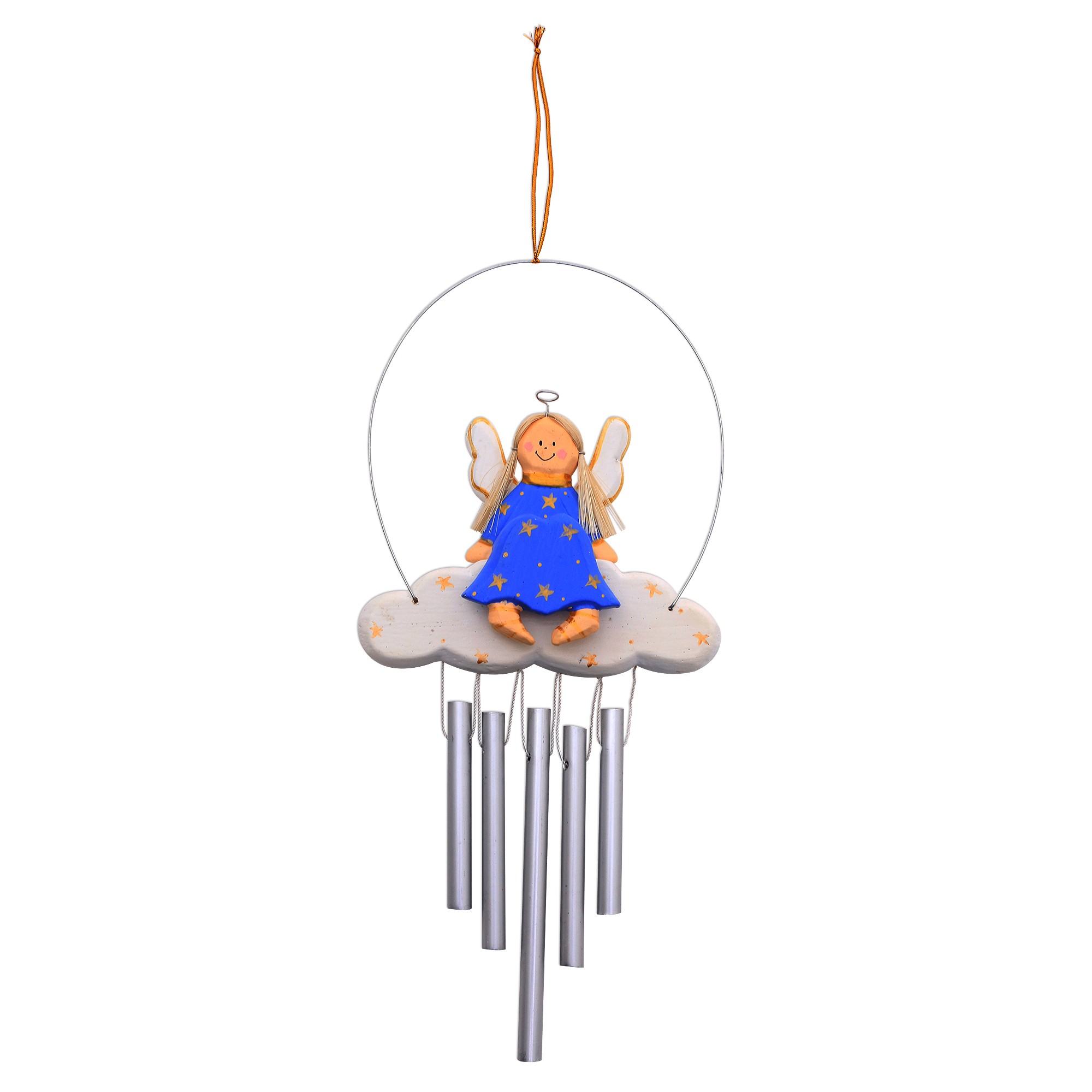 Wearing a blue dress, a lovely angel sits atop a cloud in this festive set of wind chimes from Bali. Togog Suyasa designs the wind chimes. The angel and cloud are crafted of albesia wood while the wind chimes below are made of aluminum. The angel's hair is made of pandan fiber.
