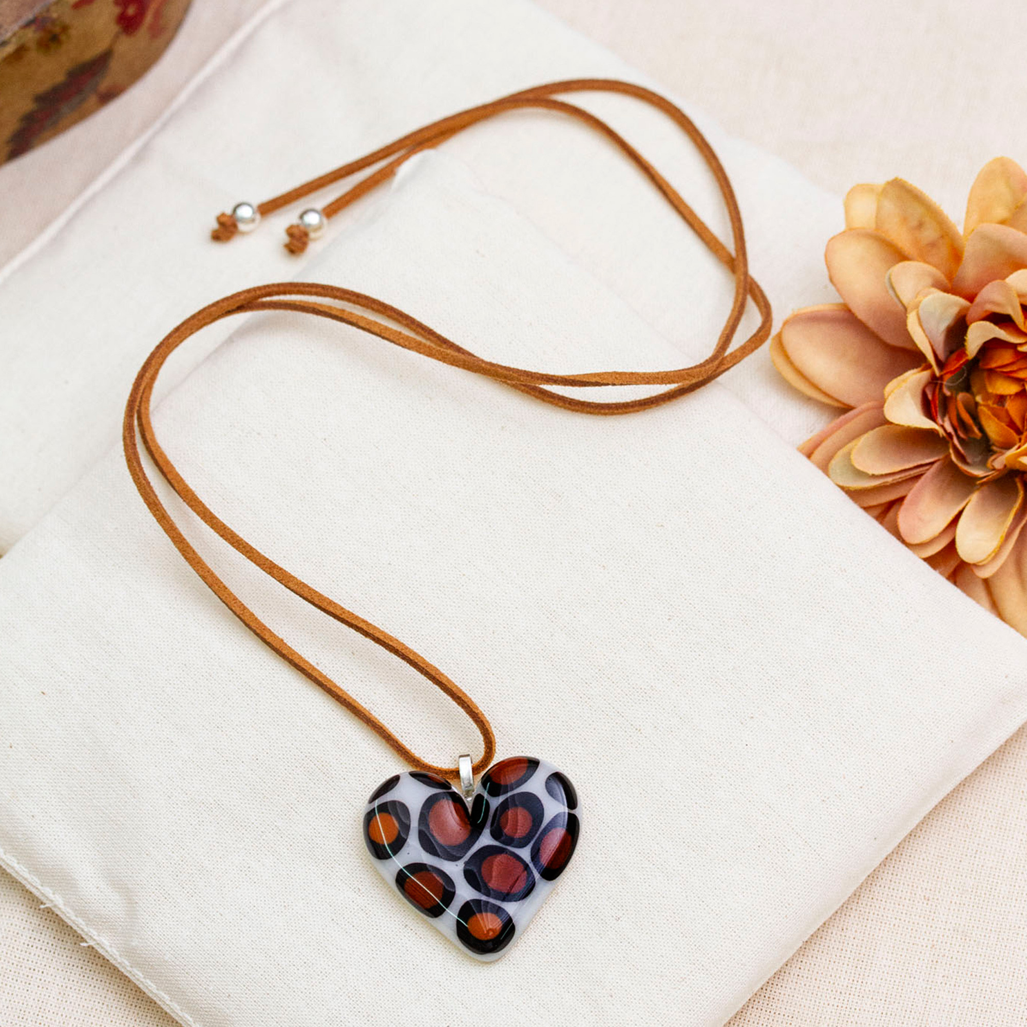 This unique necklace features a heart-shaped fused glass pendant with a bold animal print that catches the eye. Set against a refined suede cord with sterling silver details, Mexican artisan Fabiola Quevedo's stunning design feels both playful and polished. The adjustable tie closure ensures it sits just the way you like it.