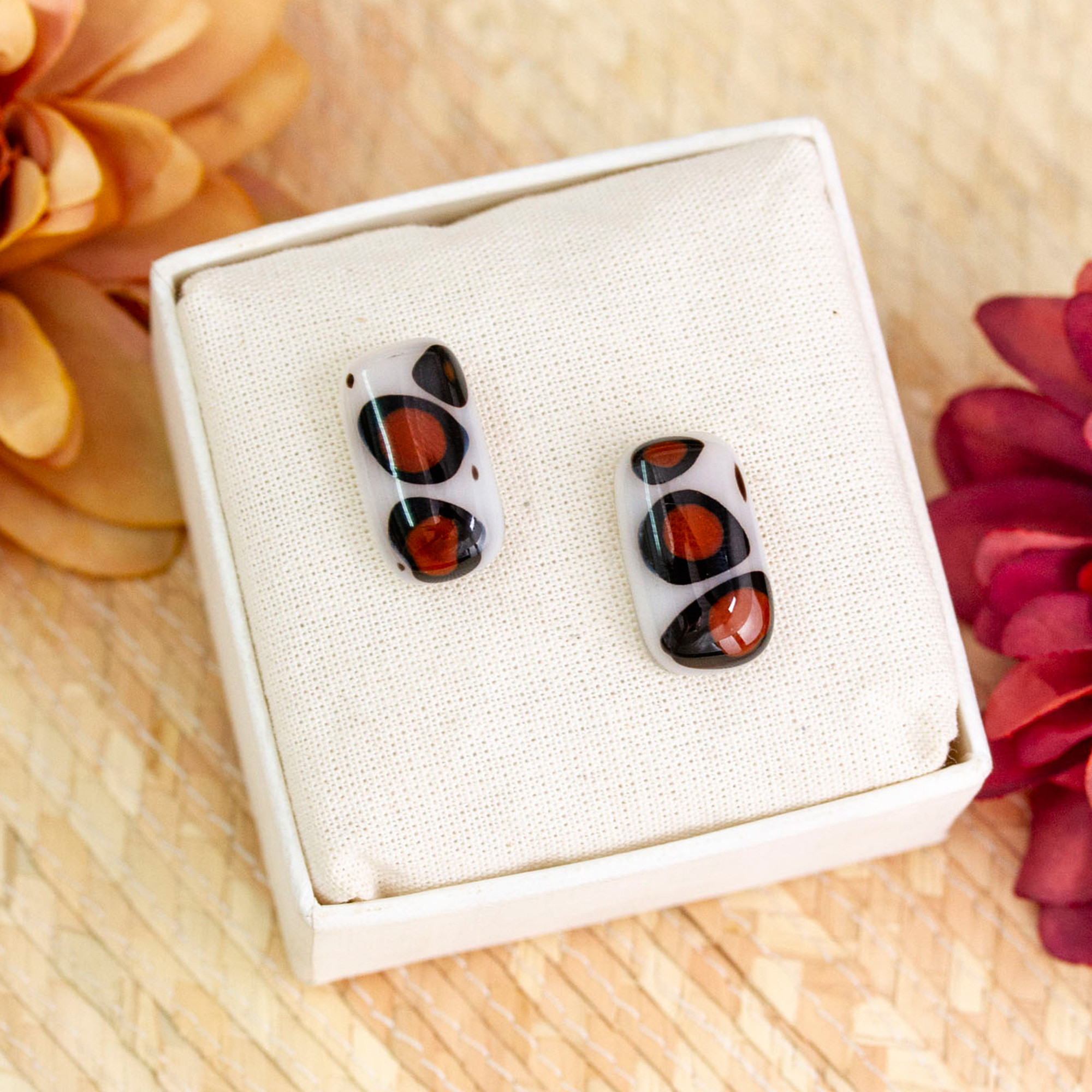 Dare to stand out with these rectangular button earrings that refuse to blend in. The wild animal print, skillfully rendered in fused glass, showcases Mexican artisan Fabiola Quevedo's artistic prowess while broadcasting your fearless approach to fashion. Anchored by elegant 18k gold-plated nickel posts, these irresistible earrings will turn heads wherever you go.