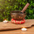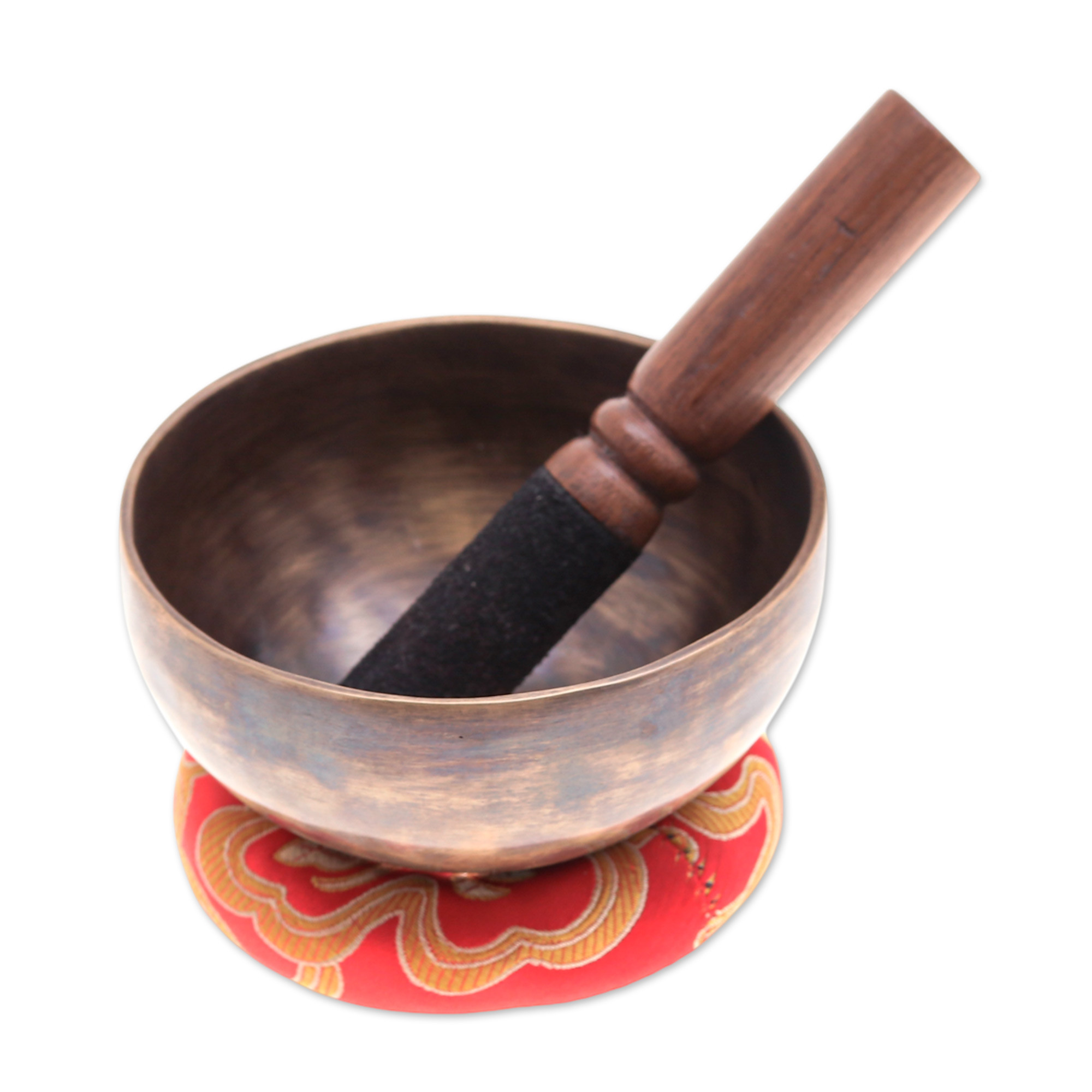 Monastery bells seem to whisper through this captivating three-piece singing bowl set, lovingly presented by Rujan Baidya to bring Tibetan peace into daily life. Crafted from a premium brass alloy by gifted Thai artisans, the bowl features a beautifully aged, hand-hammered finish. Through either striking or rim play, the responsive surface yields rich tones when met by the included mango wood and faux leather mallet, which can be used on both ends to produce different sounds. This charming set creates an auditory meditation experience that is enhanced by the stability of the matching polyester cushion.