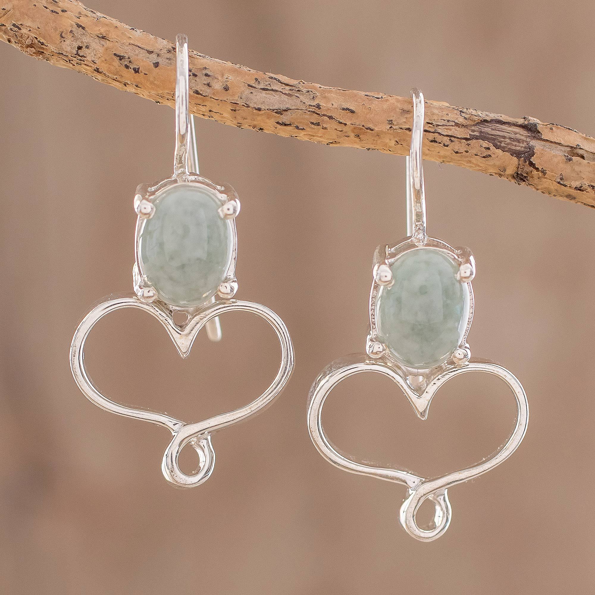 Two open hearts are crafted of sterling silver below ovals of natural jade in verde manzano, or "apple green." Guatemalan artisan Nicte Migliozzi crafts this lovely pair of drop earrings.