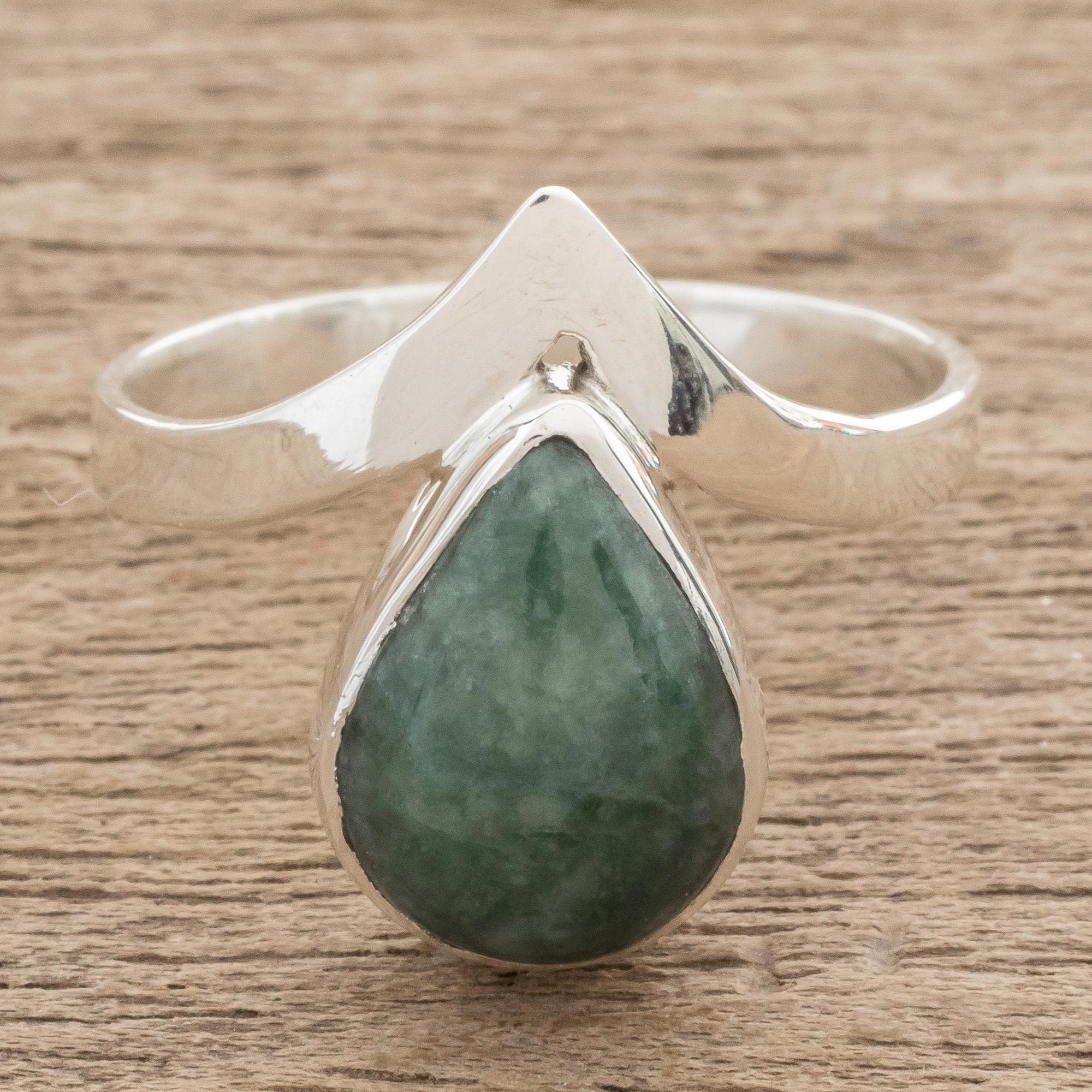 Framed by sterling silver, a teardrop of natural "apple green" jade centers this cocktail ring from Guatemala. By members of the Jimenez Family, this Maya-inspired cocktail ring circles the finger with a simple band that comes to a point.