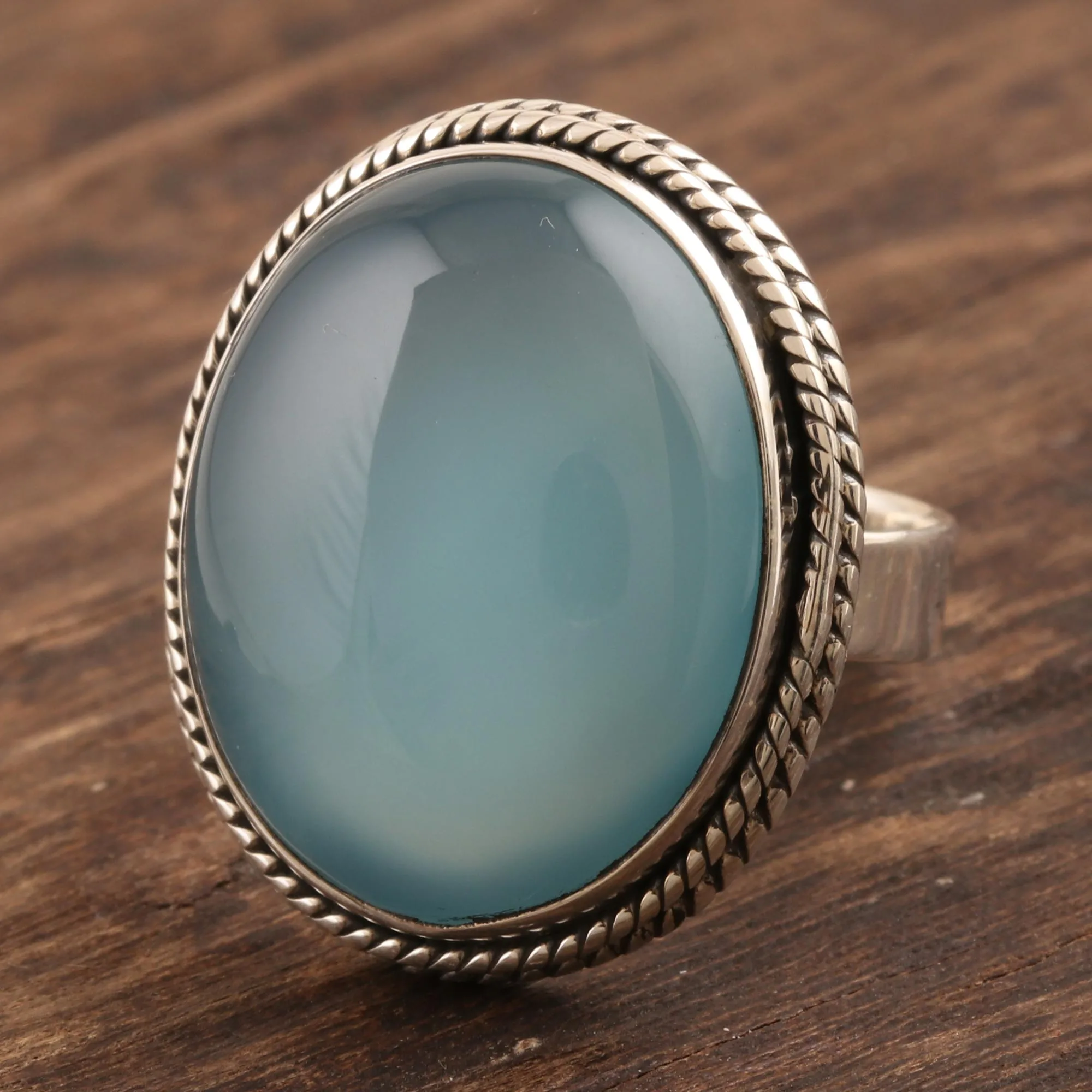 Chalcedony's watery depths are inviting in this cocktail ring from Rakesh Rana in India. Artisans set the aqua gemstone in sterling silver with a rope-style edging around the bezel.