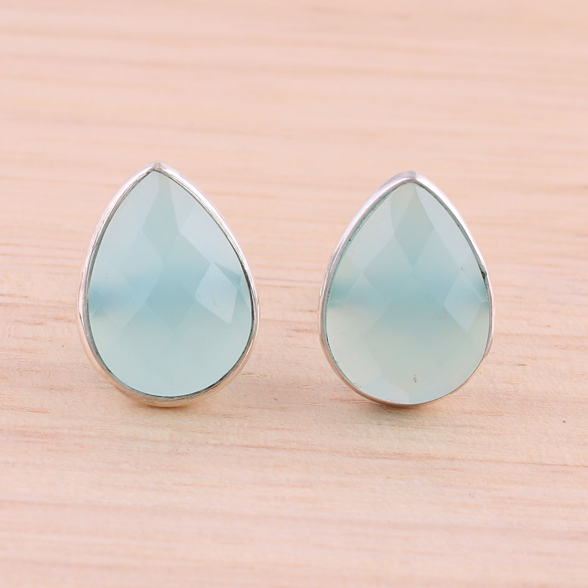 Aqua Chalcedony Sterling Silver Button Earrings from India, 'Raindrop Prisms'
