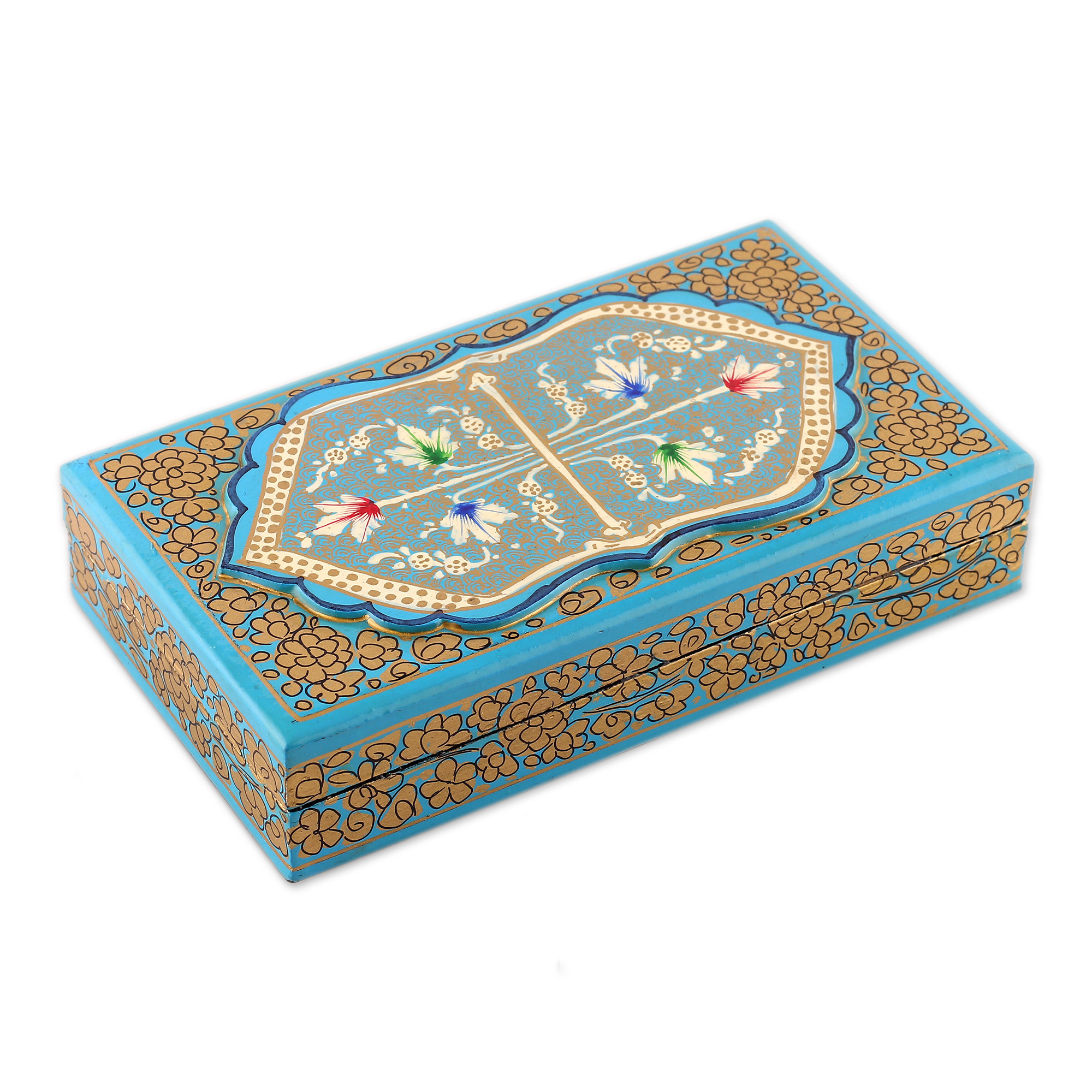 Aqua Hand Painted Folk Art Papier Mache Wood Decorative Box, 'Aqua Chinar Embrace'