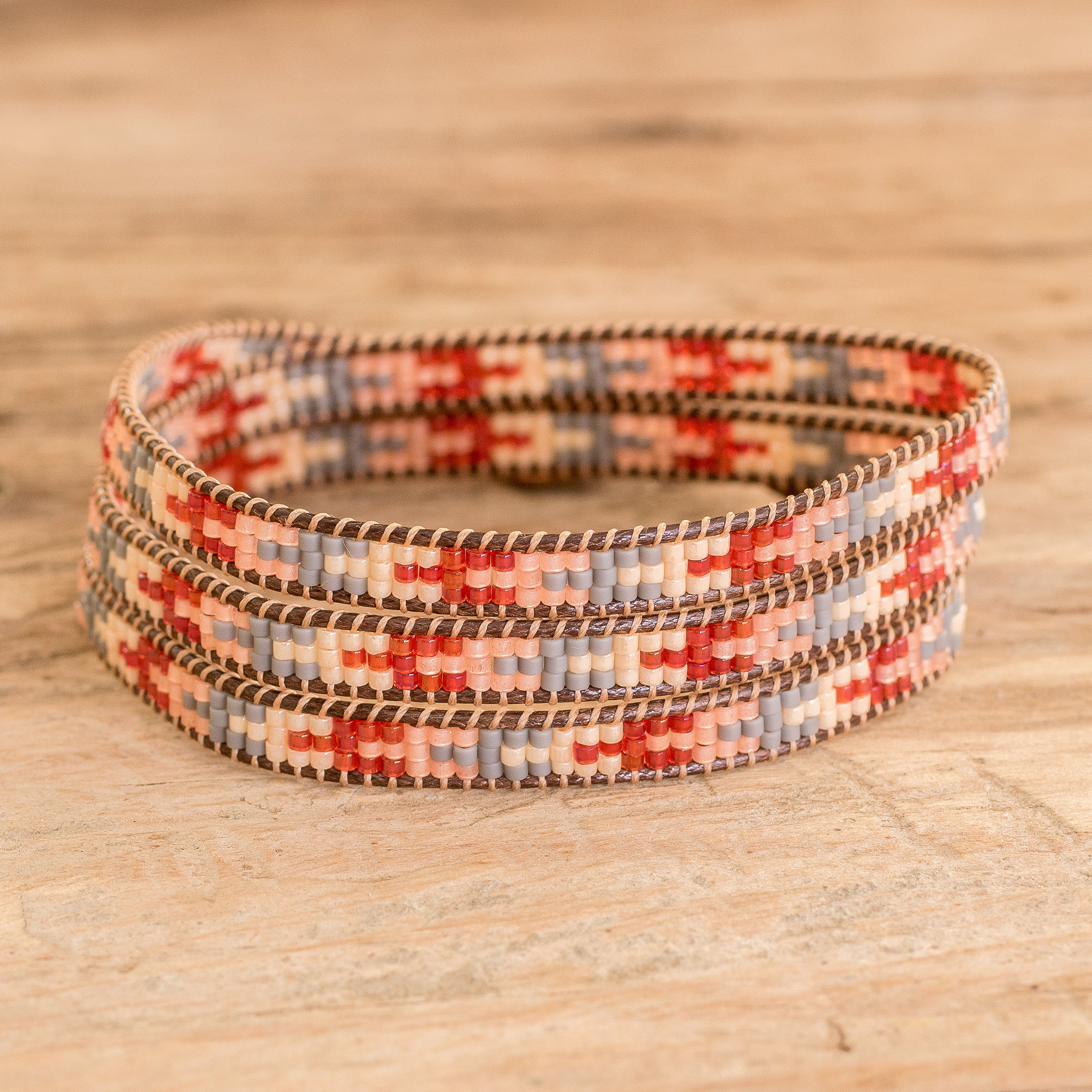 Little arrows appear to indicate a mysterious direction with a sweet palette. Handcrafted by Guatemala's Álvaro Ratzan, this glass beaded wrap bracelet also comes with a pewter button clasp that allows a comfortable and easy fit.