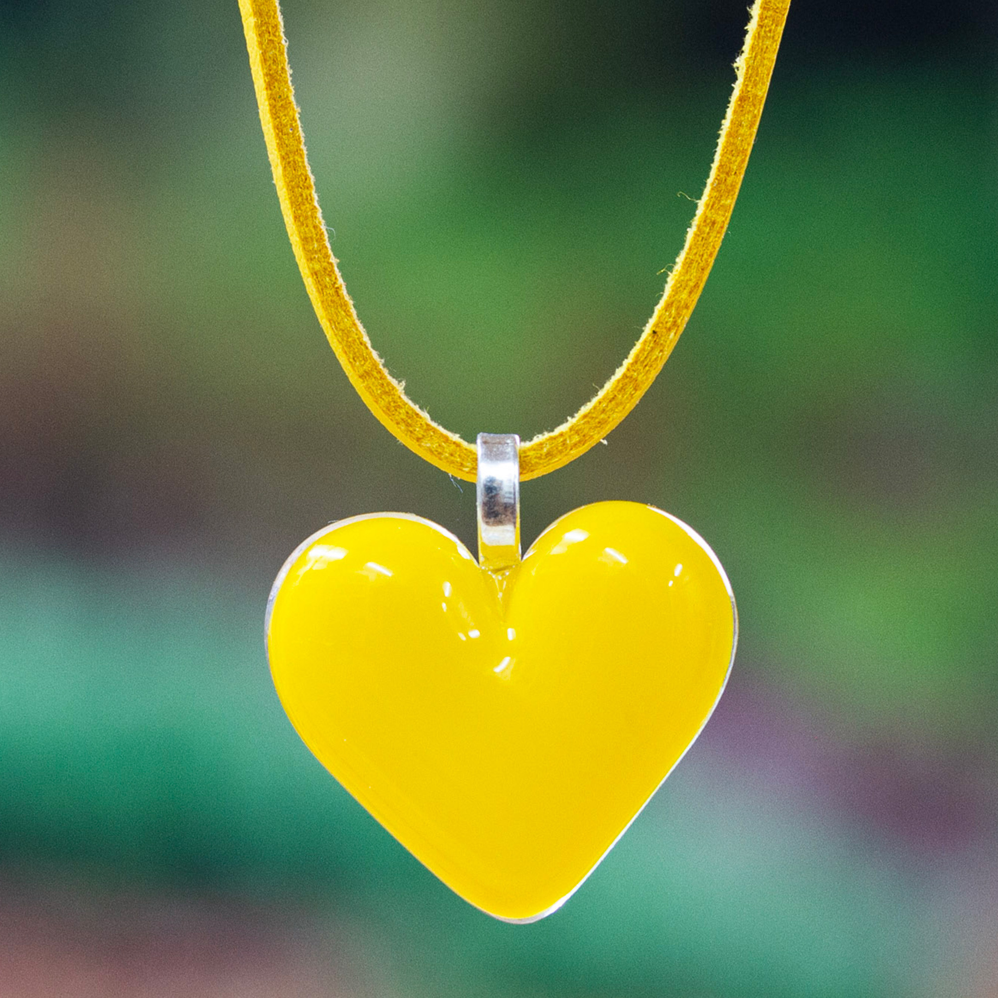 A luminous goldenrod heart beats with joy and optimism in Fabiola Quevedo's newest creation. From Mexico, the artisan works with the classic fused glass technique to create this necklace, whose one-tone suede cord and heart-shaped pendant explore the chic side of romance. The accessory, accented with sterling silver beads at the ends, allows you to adjust its length thanks to a practical design.