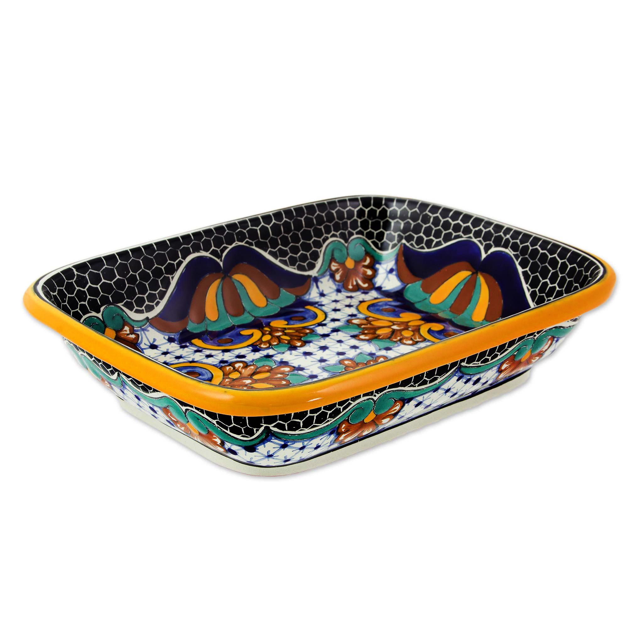Flowers blossom with an exuberant feast of colors on a casserole designed in the Talavera style of the state of Puebla. The motifs are painted by hand over the ivory-color ceramic dish with a palette that includes yellow-orange, blue, and green flowers over a crisscross network of dots and crosses. Bordered by a black honeycomb, this tray comes from the 'Zacatlán Flowers' collection designed by Pedro Tecayehuatl.