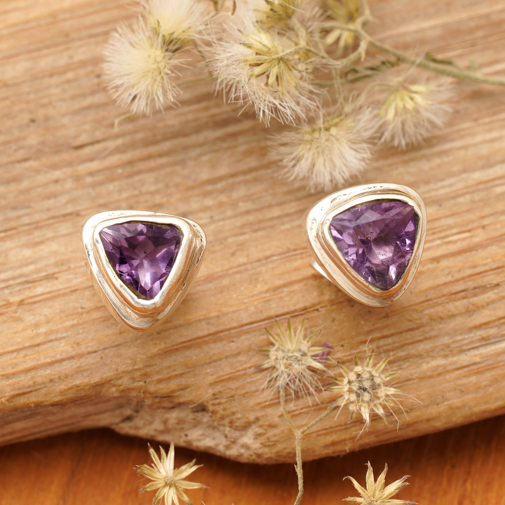 Scintillating trillion-cut amethyst gems are the center of attention in these simple stud earrings from Kenari in Bali. The gemstones, which total one carat, are set in polished sterling silver bezels.