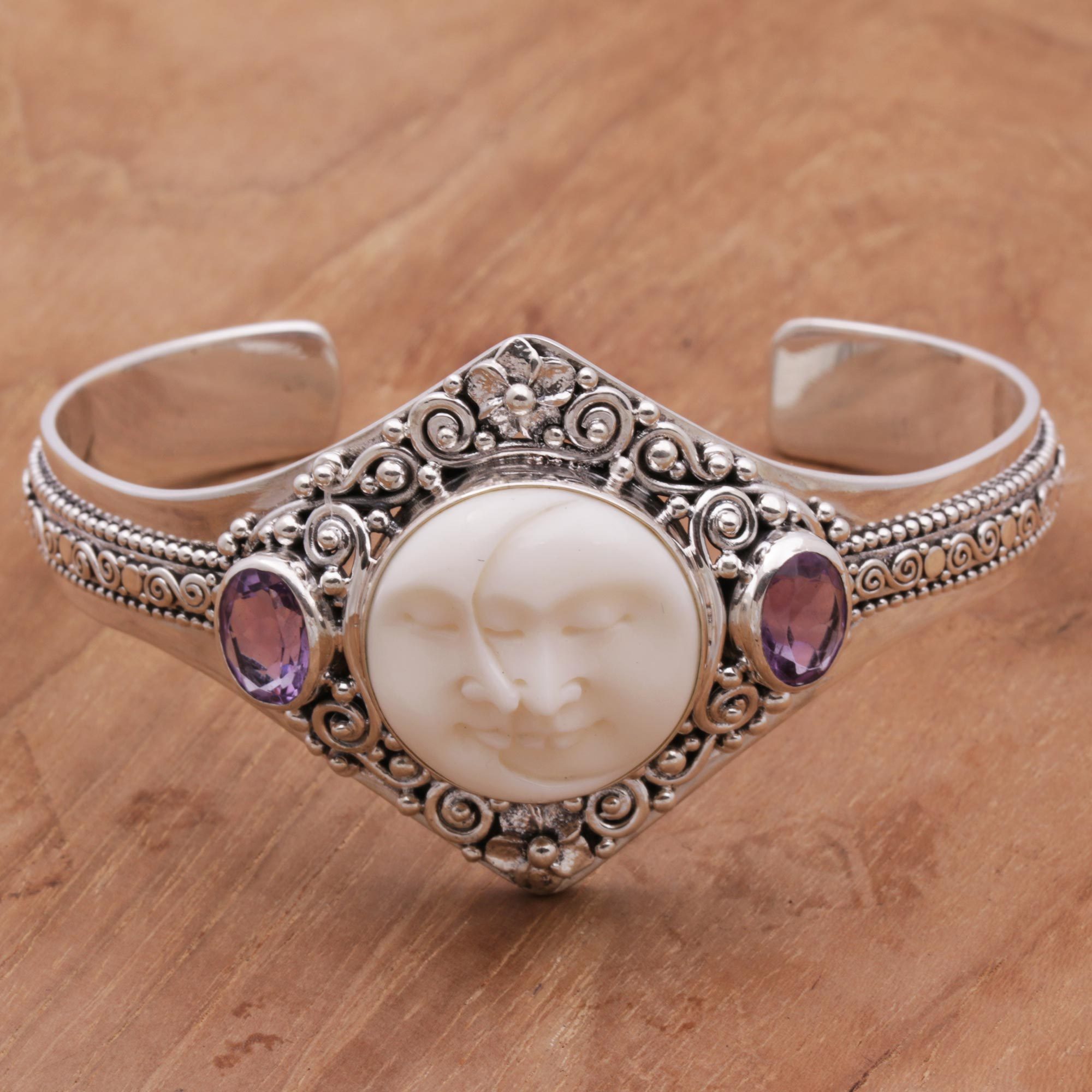 The sun and the moon share a loving embrace, carved by hand of bone at the center of this Balinese cuff bracelet. Buana designs it, flanking the center image with three carats of amethyst stones in a cuff of sterling silver with floral and spiral motifs.