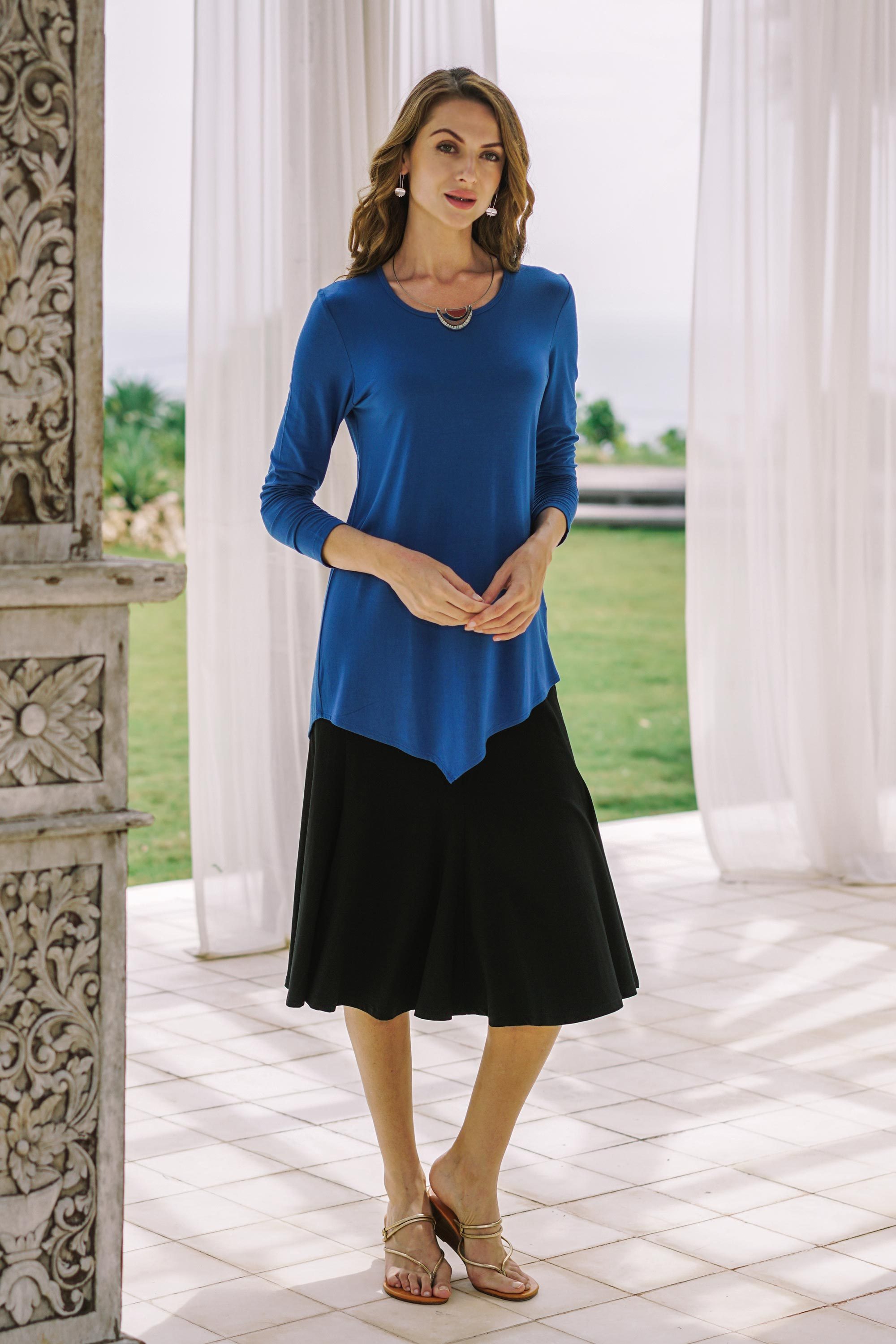 Inspire ardor from onlookers in this classic flared black skirt designed by Janet Molloy in Bali. Crafted from soft, smooth modal and just a hint of spandex, the knee-length skirt features a relaxed fit that will keep you comfortable and stylish.