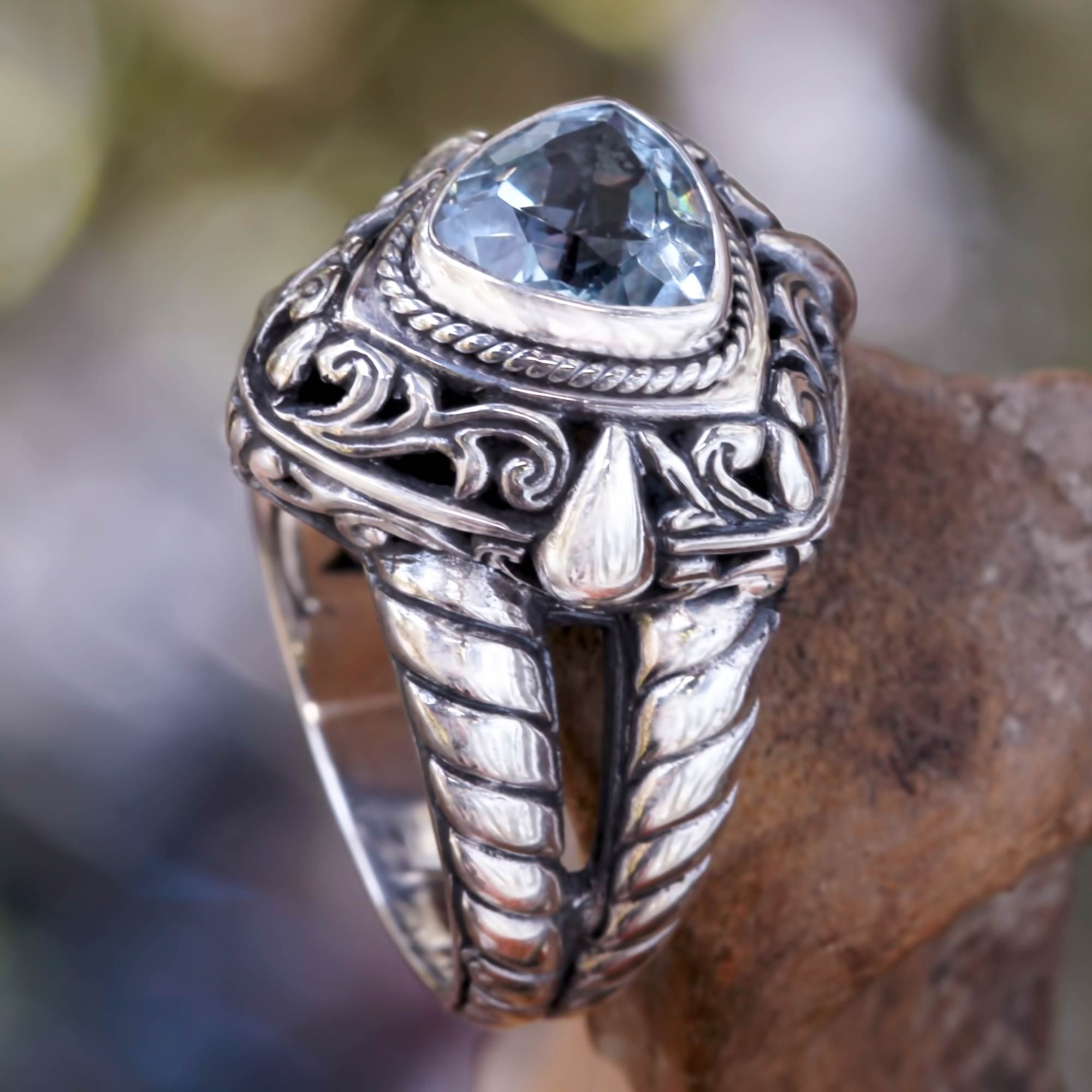 Cast your own spell with this enchanting 2 carat sky blue topaz cocktail ring from Kadek Hendra. The Balinese artisan crafts the ring from sterling silver, adding florid vine motifs around the bezel. Two rope-style bands are joined into one to complete the design.
