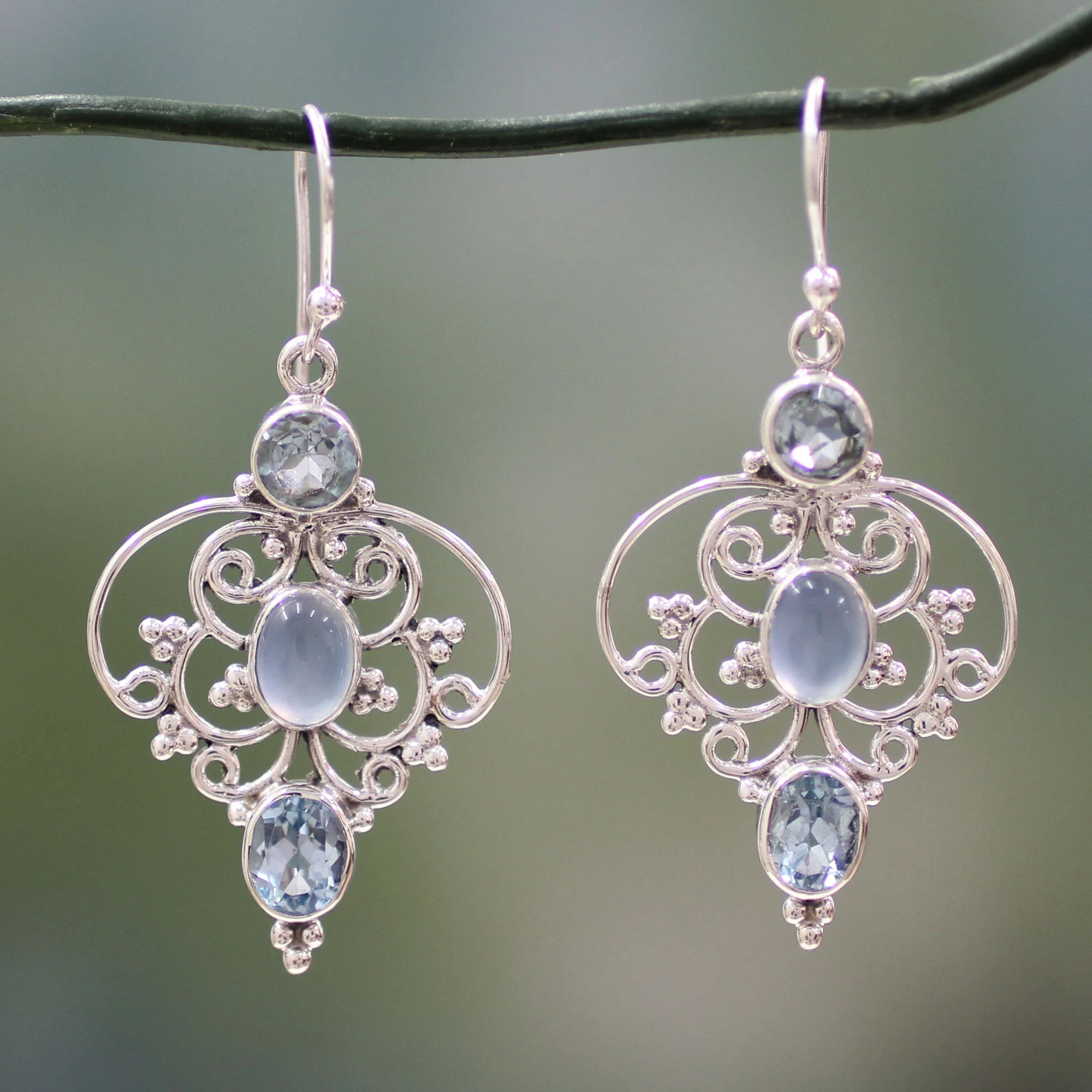 Sterling strands intertwine in graceful arabesques to embrace blue topaz that total 2.9 carats. In the center, chalcedony reveals an enhanced blue glow. Neeru Goel designs these exquisite earrings with modern Indian styling.