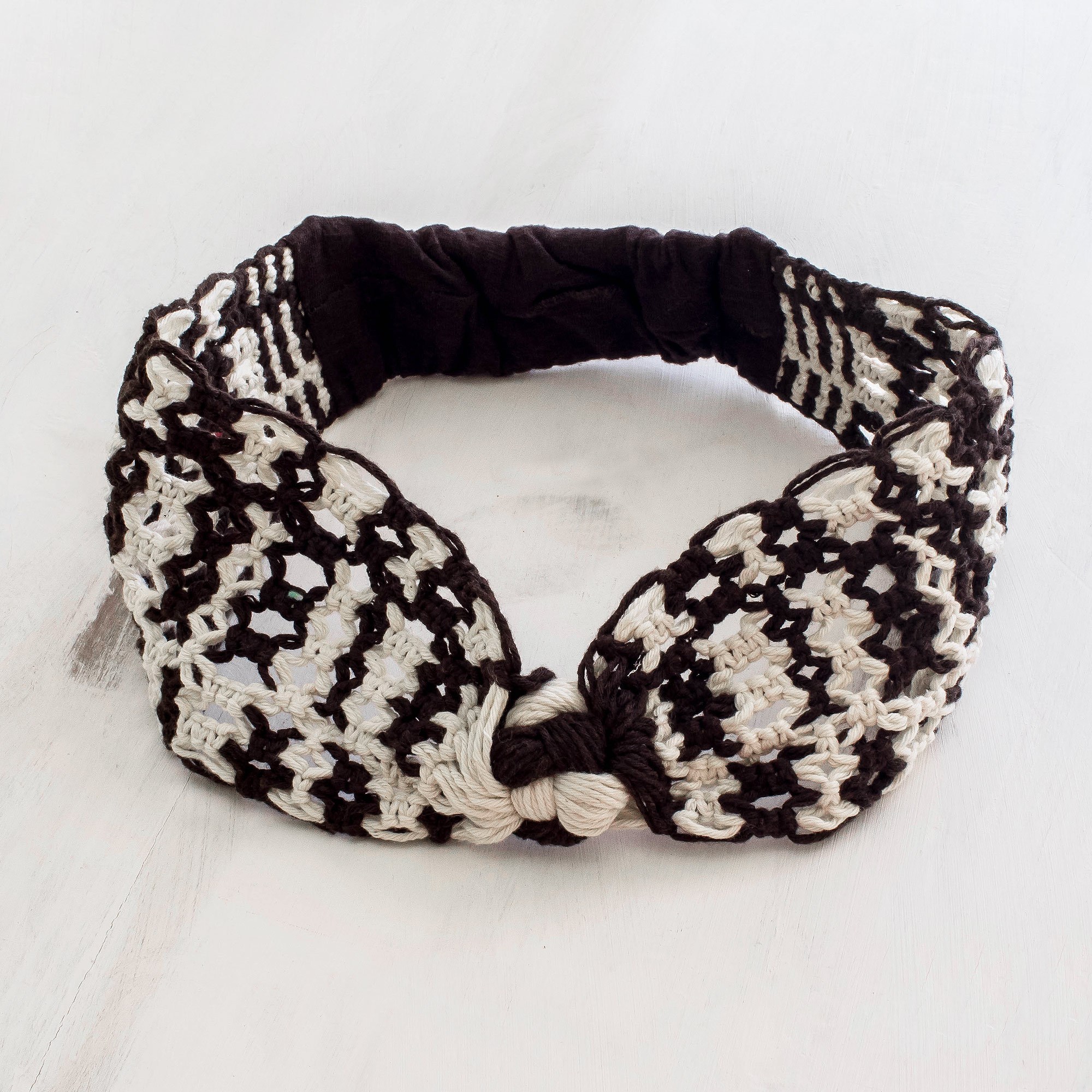 Costa Rican artisan Hilda Padilla crafts this pretty headband using traditional macrame techniques. The coffee brown and milk-white headband features a knotted motif at the front and a stretchy solid cotton segment at the back.